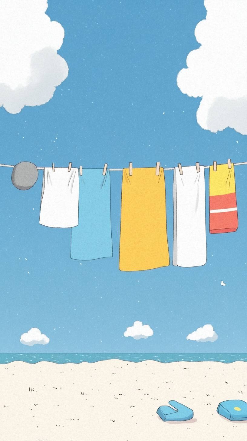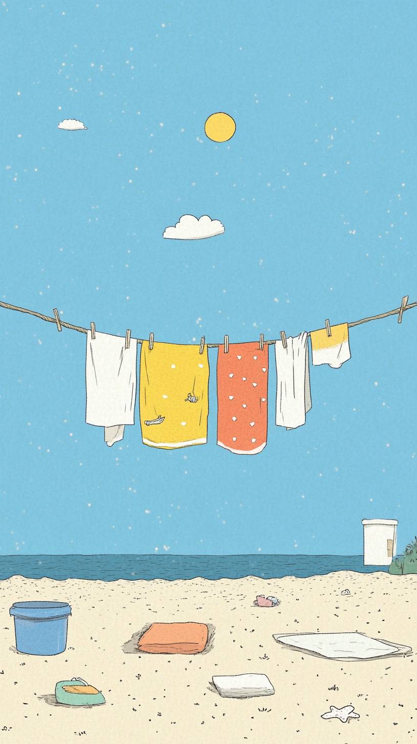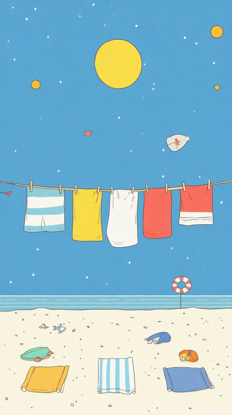 a simplified colourful retro beach poster with a central image of hanging colourful towels on a clothes line --sref 4007892812 --sw 100 --v 6.1 --stylize 200 --personalize ocyetej --ar 9:16