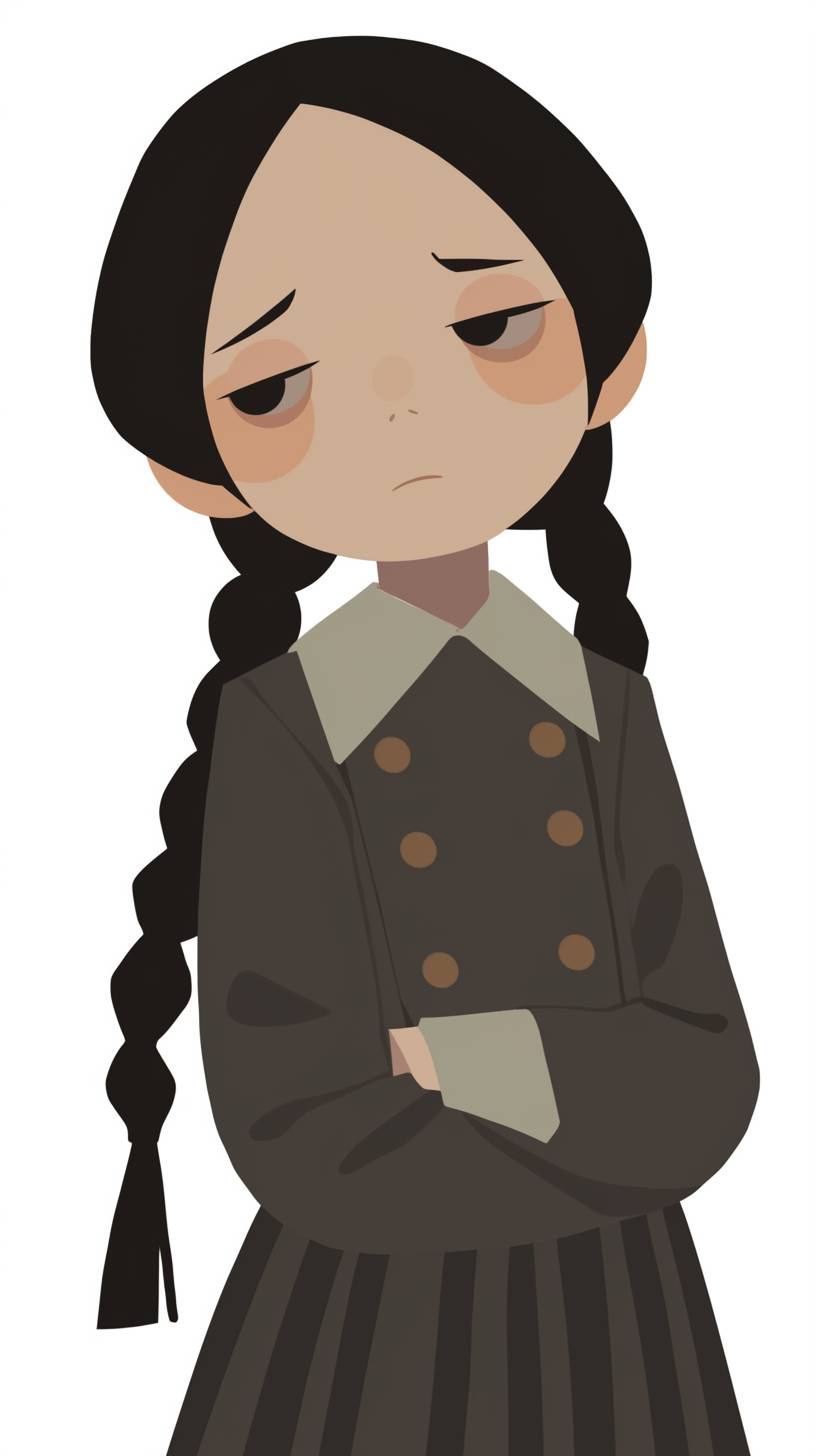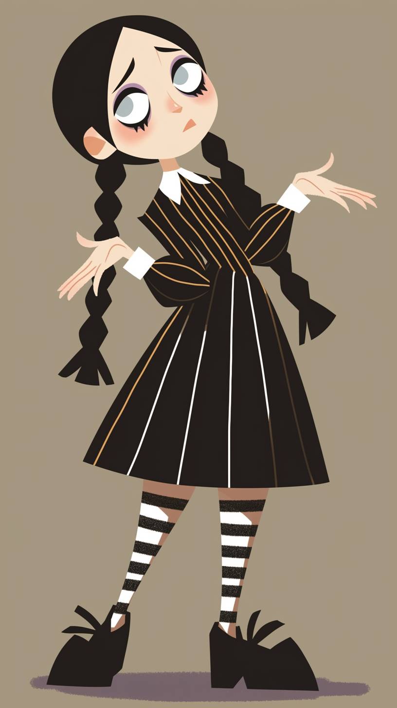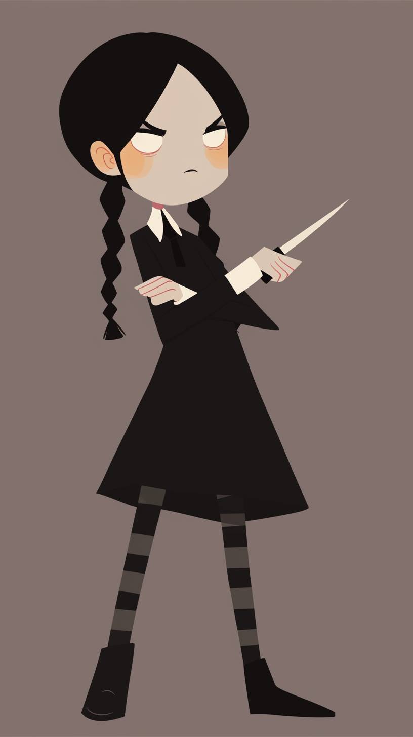 A simple drawing of Wednesday Addams, in the style of Allie Brosh with simple lines, flat colors and a stick figure, minimalistic, simple background --ar 9:16 --style raw --niji 6