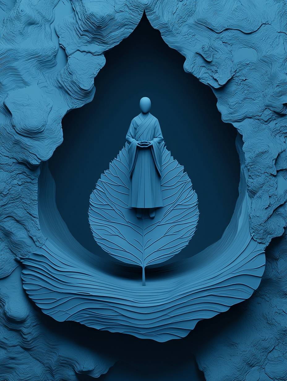 A bird's-eye view of a vast, calm lake at dawn. An abstract, tiny warrior in a blue-gray robe stands on a moving leaf boat. The lake is flowing as smooth as silk. The leaf boat is in the middle of the lake. There is no background. The graphic design uses an illustration style and minimalist art style. It uses Eiko Ojala style and Bauhaus style poster design. 3D rendered art image, detailed texture surreal image, high quality, high detail, 8K HD resolution --chaos 30 --ar 3:4 --quality 2 --stylize 250 --v 6.1