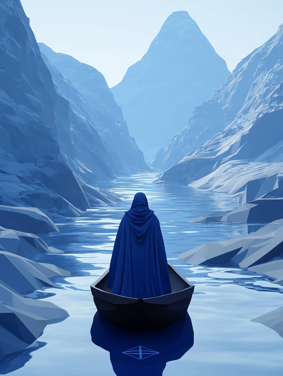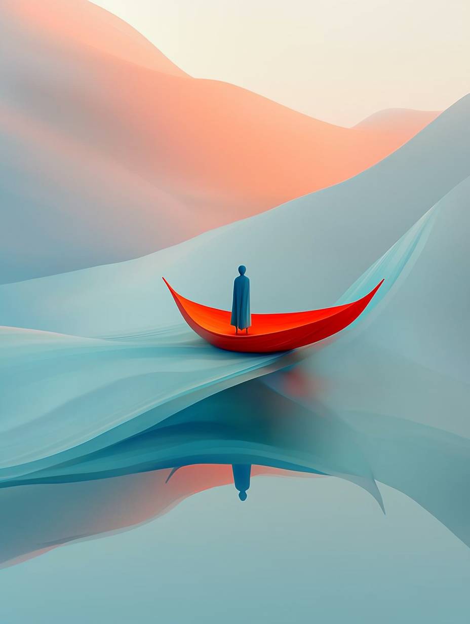 منظر جوي لبحيرة شاسعة وهادئة عند الفجر. محارب صغير مجرد في رداء أزرق رمادي يقف على قارب ورقي يتحرك. البحيرة تتدفق بسلاسة كما الحرير. القارب الورقي في منتصف البحيرة. لا يوجد خلفية. يستخدم التصميم الجرافيكي أسلوب الرسم و أسلوب الفن البسيط. يستخدم أسلوب إيكو أوجالا وتصميم الملصقات بأسلوب باوهاوس. صورة فنية ثلاثية الأبعاد مُعَدّة ، صورة سريالية بتفاصيل دقيقة ، عالية الجودة ، عالية التفاصيل ، دقة 8K.