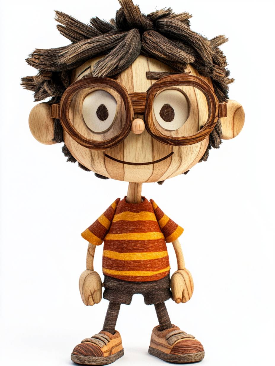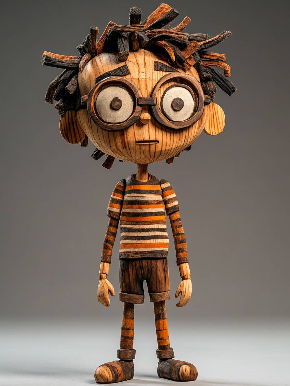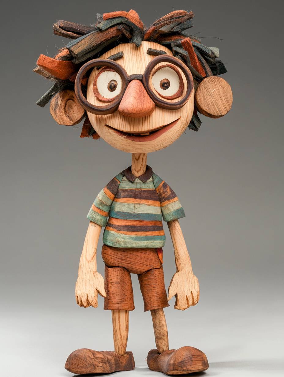A charming puppet resembling a Disney-style character in Pixar animation style. He has a youthful and intelligent appearance with intricately carved hair made from polished wood, shaped into a messy, playful style. His body, along with his outfit, is entirely crafted from polished wood, with detailed and prominent wood grain patterns visible throughout. His costume resembles a casual outfit, with a striped T-shirt and shorts, but crafted seamlessly from different shades of wood, adding a whimsical touch. His oversized glasses are also carved from wood, emphasizing his clever and quirky nature. His expression is irresistibly cute, friendly, and sharp, with a glimmer of intelligence in his large, expressive eyes. The overall design balances his wooden texture with an adorable, lively charm, creating a puppet that looks both lifelike and full of personality. --ar 3:4 --v 6.1