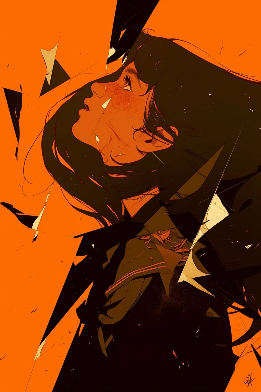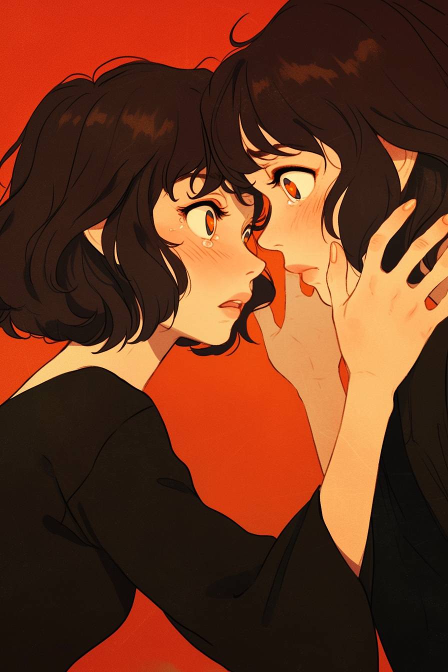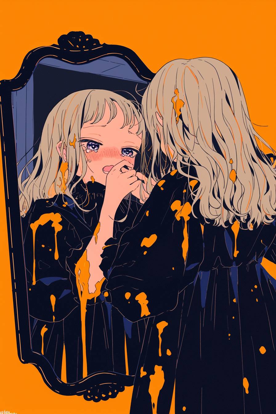 خطوط داكنة، خلفية برتقالية، أسلوب قطع الحياة. تكتشف امرأة أن انعكاسها في المرآة بدأ يتحرك بشكل مستقل عنها. سرعان ما يبدأ الانعكاس في السيطرة على حياتها، مما يجعلها تتساءل عما إذا كانت هي الحقيقية. لقطة كاملة لجسم شخصية تحدق في المرآة بينما يقوم انعكاسها بشيء مختلف تمامًا، رمز قلب في بؤبؤ العين، فم مفتوح وخدود محمرة، لقطة مقربة، أنمي من السبعينيات، تفاصيل سريعة.