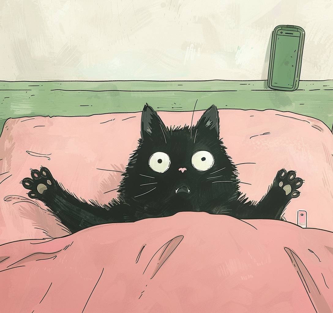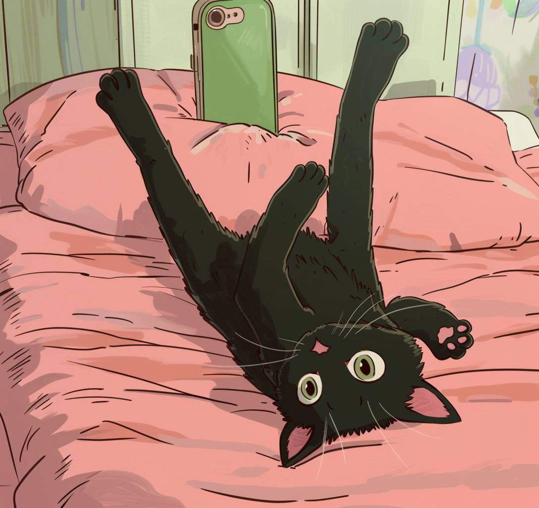 قطة سوداء مستلقية على سرير وردي، وبطنها مرفوع مع رفع رأسيها عالياً وعينيها مفتوحتين على مصراعيها كما لو كانت تلعب بسعادة. الخلفية تتميز بهاتف محمول أخضر قديم موضوعة بشكل عامودي على مستوى الصدر، مع حائط أبيض أمامها. تتميز بخطوط ناعمة، وألوان بسيطة، وستايل مرسوم يدويًا، تم تصميمه على نمط ستوديو غيبلي، مصمم لكتب الأطفال.