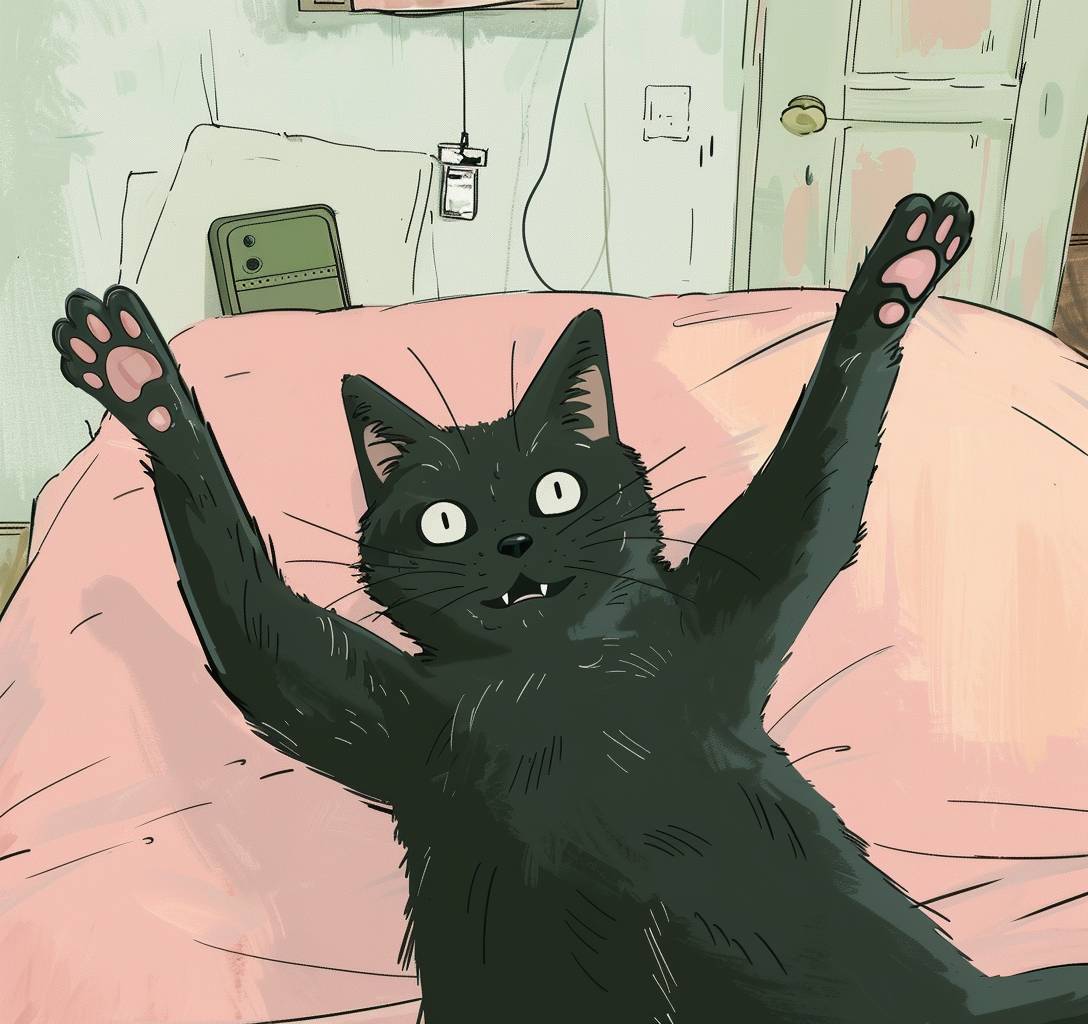 قطة سوداء مستلقية على سرير وردي، وبطنها مرفوع وذراعيها مرفوعتين وعينيها مفتوحتين على اتساعها كما لو كانت تلعب بسعادة. الخلفية تتكون من هاتف أخضر قديم موضوع بشكل عمودي على ارتفاع الصدر، مع جدار أبيض أمامه. يمتاز بأسلوب خطوط ناعمة وألوان بسيطة، بأسلوب مرسوم باليد مستوحى من استوديو غيبلي، مصمم لكتب الأطفال.