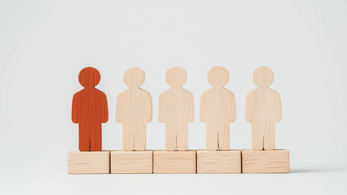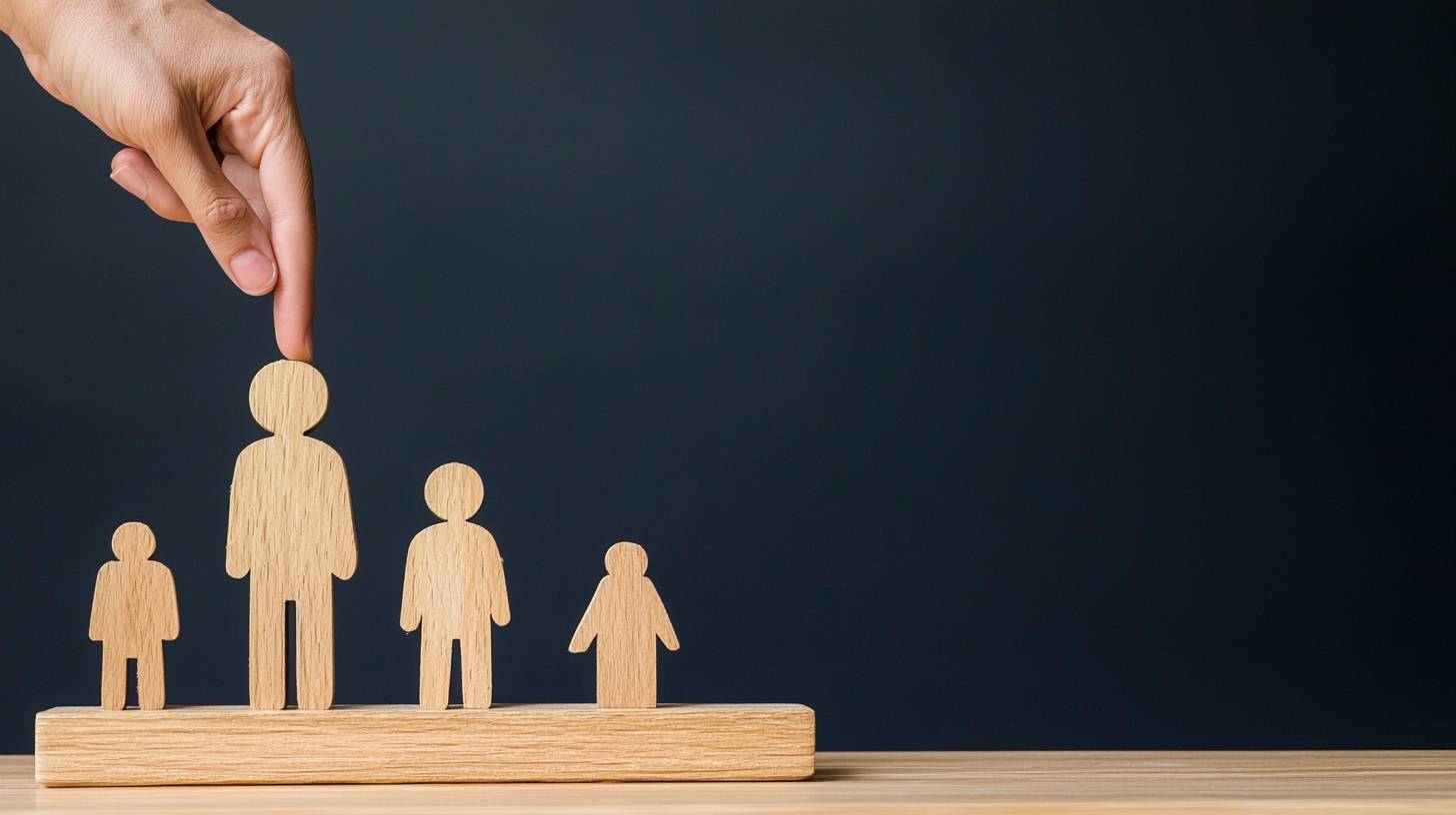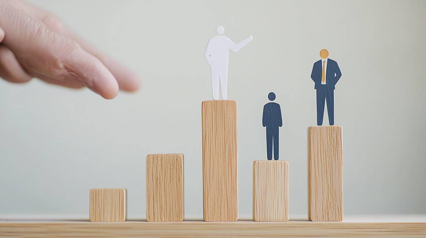 Abstract business growth concept, figures on wooden steps, career advancement, leadership and support visual. --no logo --chaos 30 --ar 16:9 --quality 2 --personalize hfzsu3i --stylize 750 --v 6.1