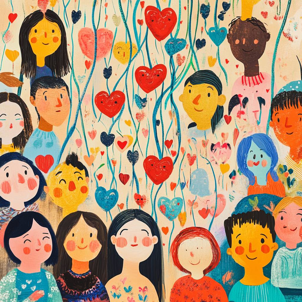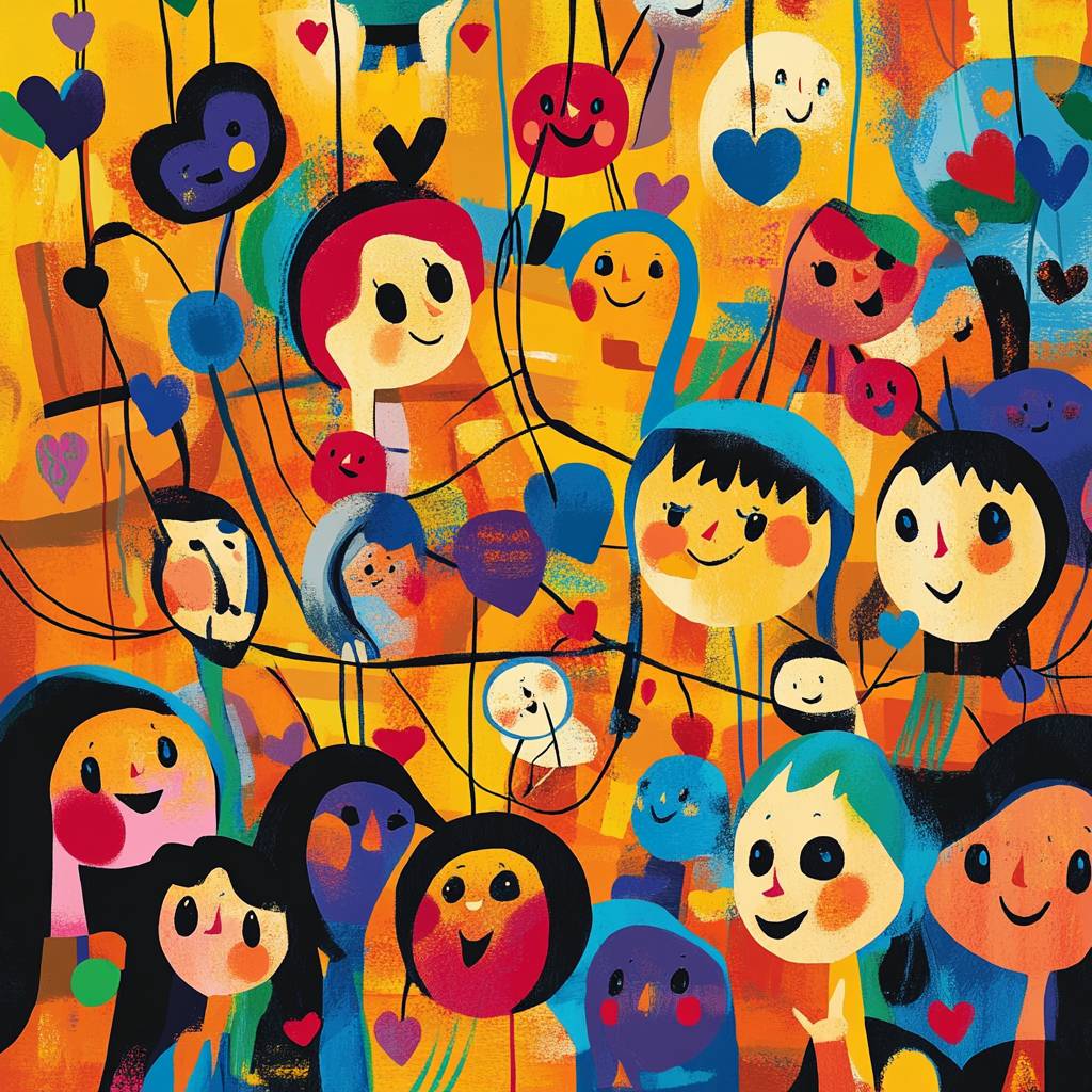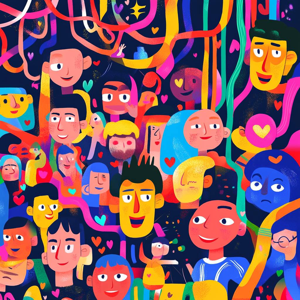 Cinematic, uhd, finest details, A vibrant and whimsical illustration that symbolizes community and relationships among diverse individuals--families, friends, and people from all walks of life. Characters are connected by colorful threads, creating an intricate web of bonds. The style is playful and abstract, with bold, bright colors, exaggerated proportions, and expressive, joyful faces. The scene is filled with quirky details: floating hearts, intertwined hands, and symbolic shapes like circles and spirals representing unity and connection. The composition should be dynamic and visually striking, emphasizing inclusivity and belonging --v 6.1