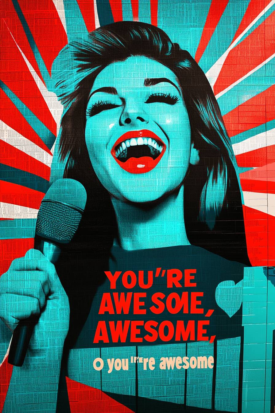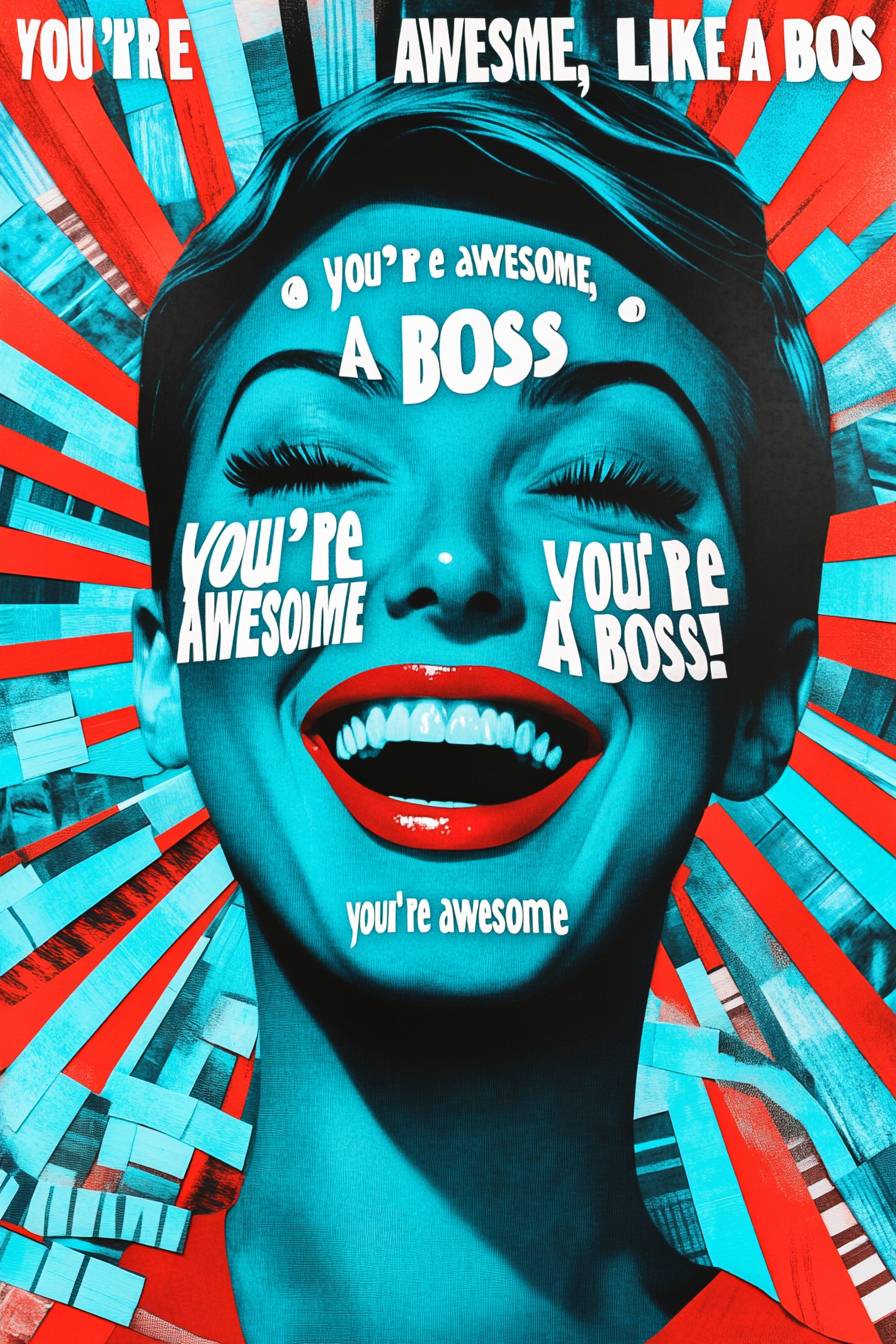 Poster design, create a abstract mosaic painting of a happy woman, create the picture out of different size words of the text "YOU’RE AWESOME, LIKE A BOSS " , make sure " you’re awesome" stands out, paper texture, paper wrinkles, stickers, graphic design, visual impact --chaos 10 --ar 2:3 --style raw --sref 1390522559 --p kbaflu5 --sw 200 --stylize 300 --v 6.1