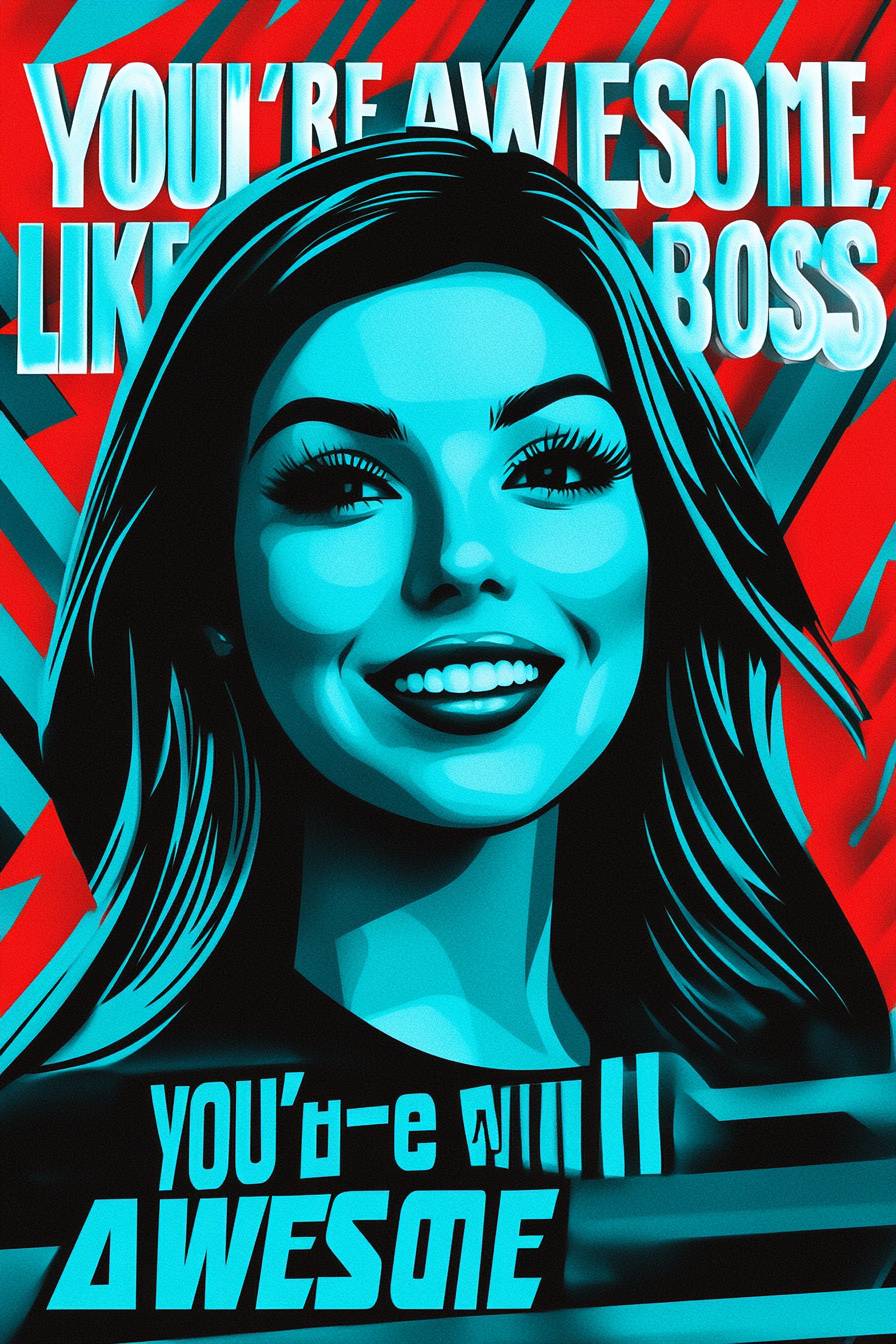 تصميم ملصق، إنشاء لوحة تجميعية تجريدية لامرأة سعيدة، إنجاز الصورة من كلمات بأحجام مختلفة من النص 'YOU’RE AWESOME, LIKE A BOSS'، تأكد من أن 'you’re awesome' بارز، نسيج ورق، تجاعيد الورق، ملصقات، تصميم جرافيكي، تأثير بصري.