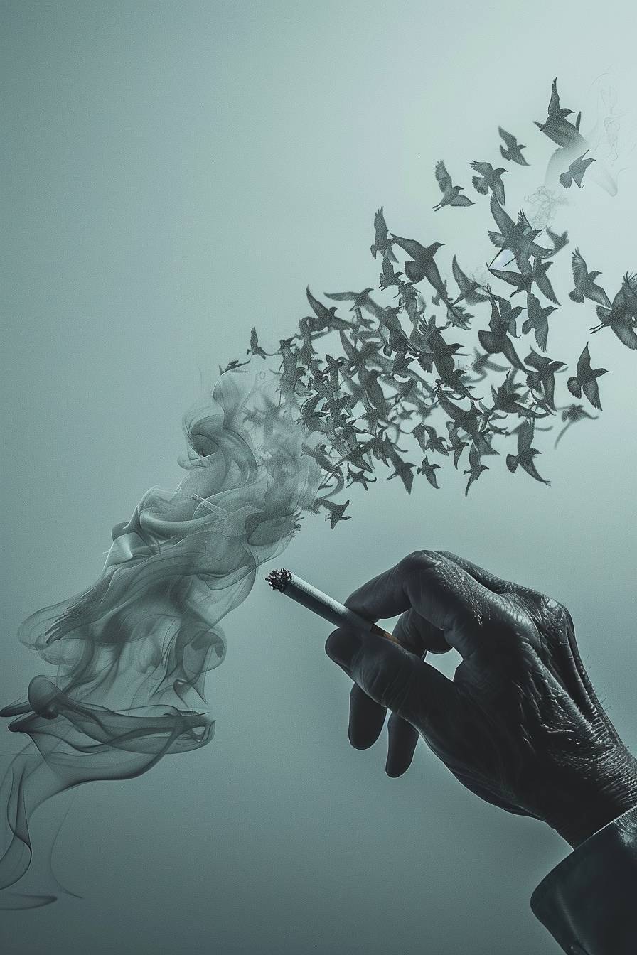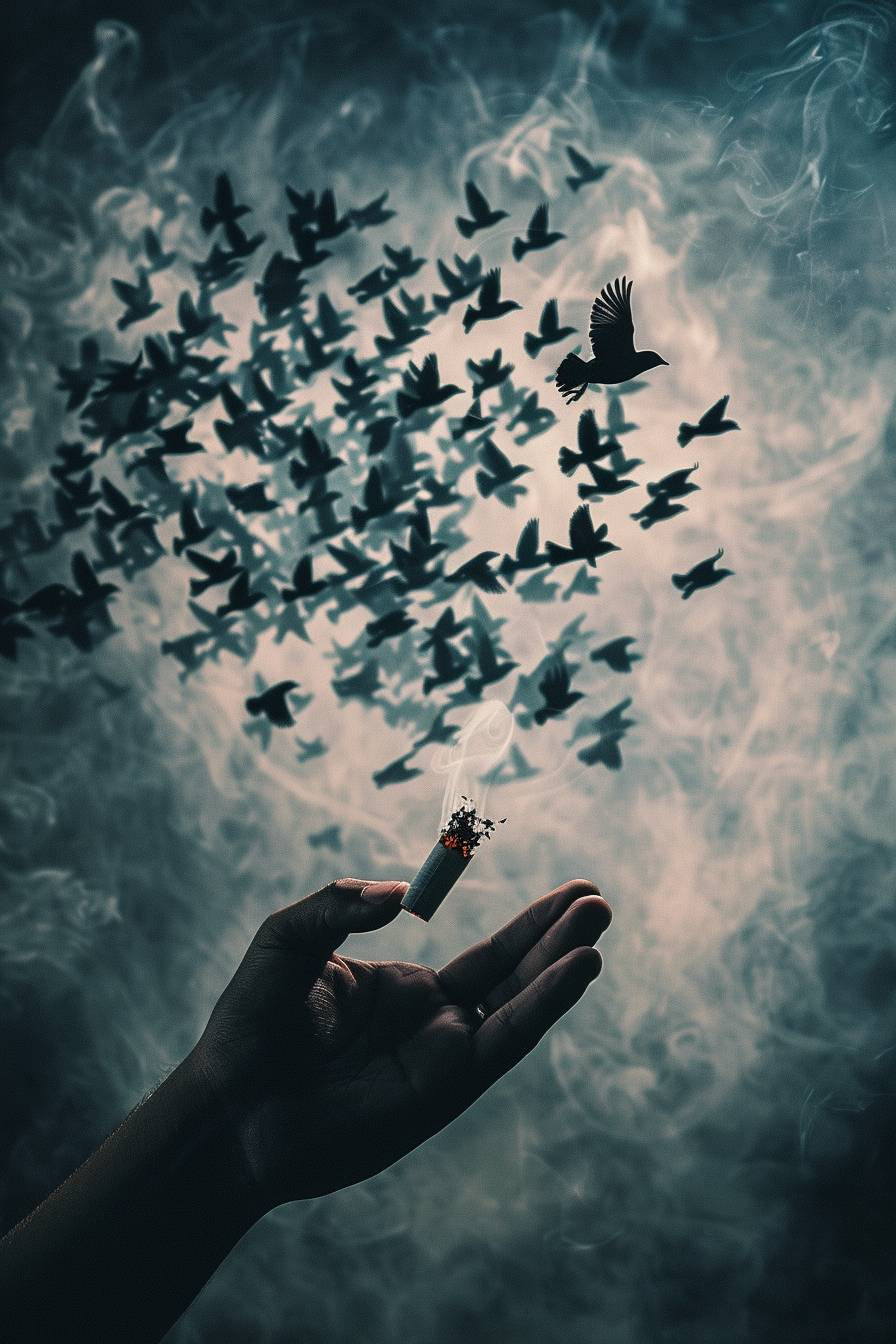 سيجارة عملاقة تتحول إلى سرب من الطيور، تطير بعيداً عن يد تمتد لالتقاطها، مما يوضح التحرر من إغراء إدمان التبغ.