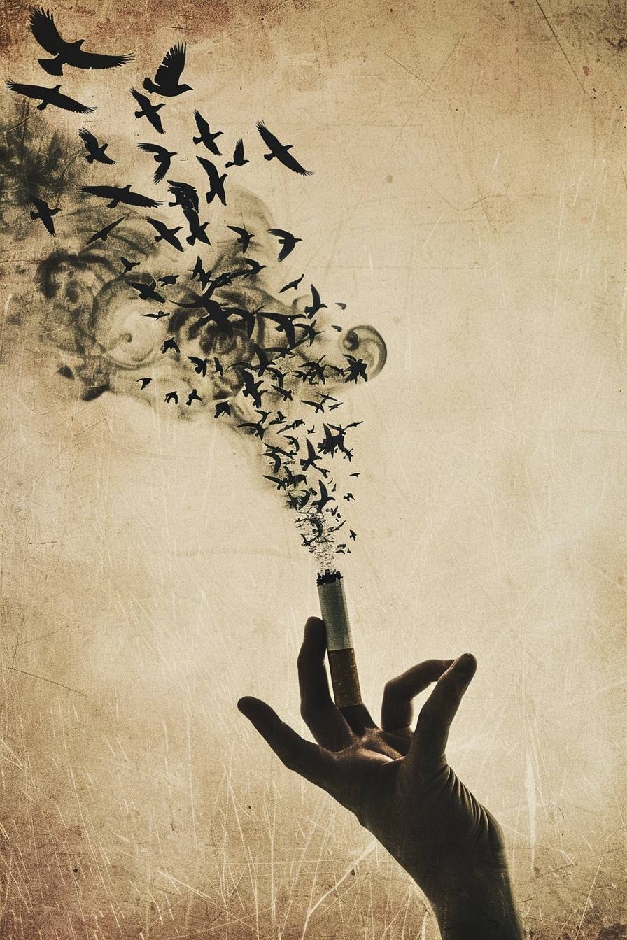أنشئ صورة لسيجارة عملاقة تتحول إلى سرب من الطيور، تطير بعيدًا عن يد تحاول الإمساك بها. وهذا يوضح الحرية من وهم وإحكام إدمان التبغ.