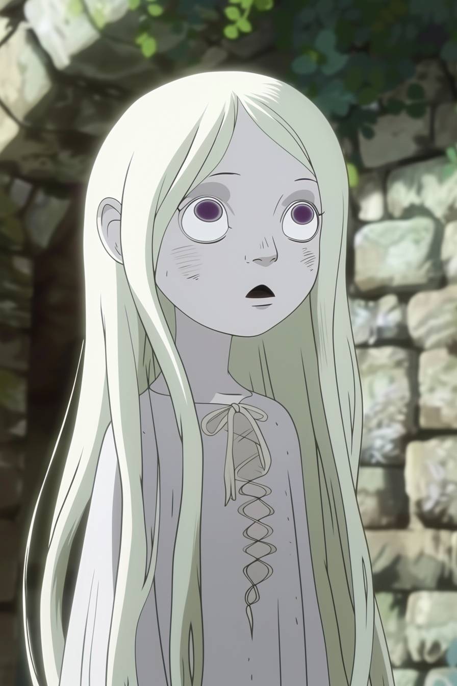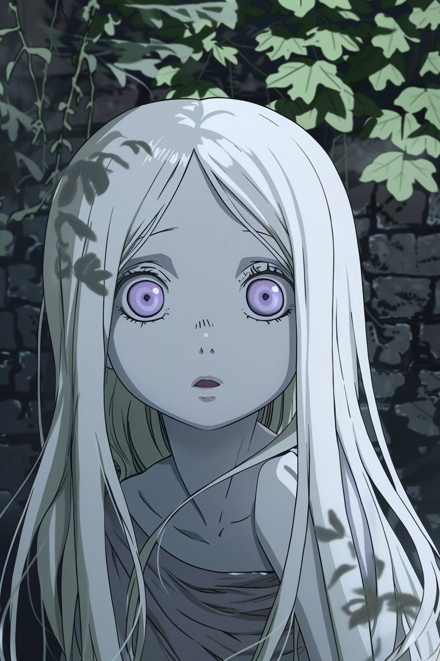 إطار فيلم يصور فتاة ألبينو شاحبة بشعر أبيض طويل وعيون بنفسجية فاتحة، بحدقة كبيرة، بأسلوب كرتوني بسيط يشبه 'أوفَر ذا غاردن وول'.