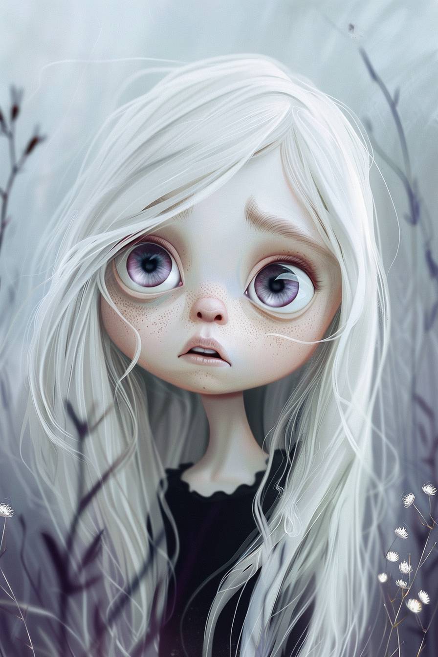 فتاة ألبينو شاحبة بشعر أبيض طويل وعيون بنفسجية فاتحة، قزحية كبيرة، أسلوب كرتوني بسيط مستوحى من Over the Garden Wall.