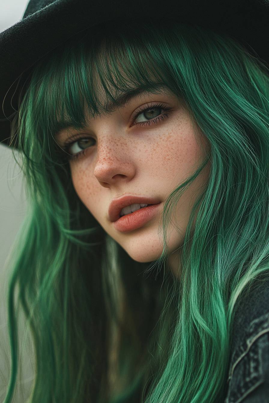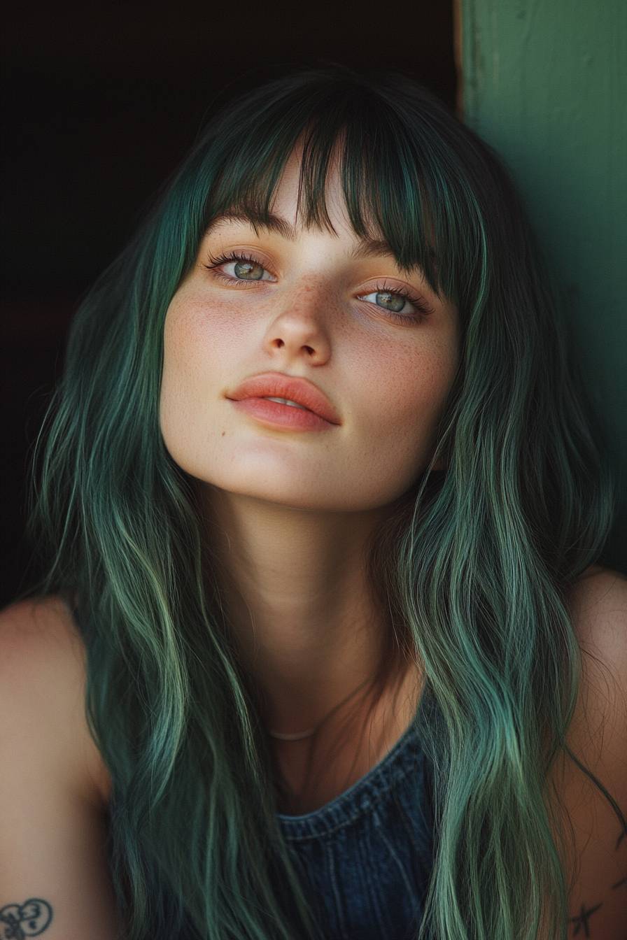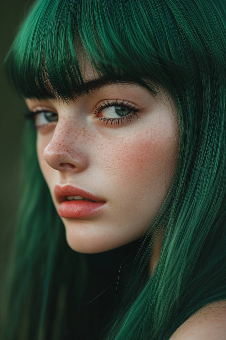 امرأة شابة ذات شعر طويل أخضر وغرة