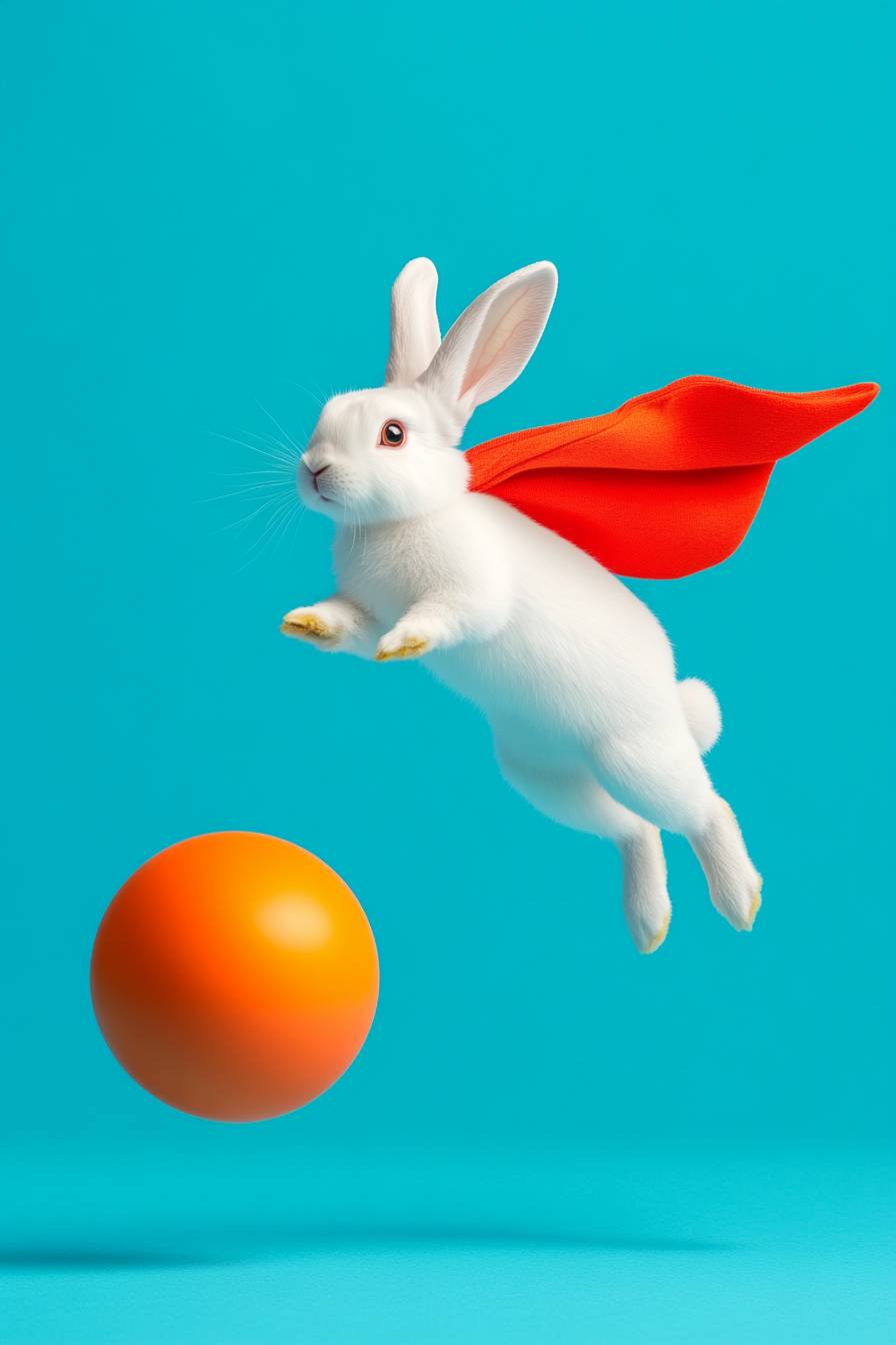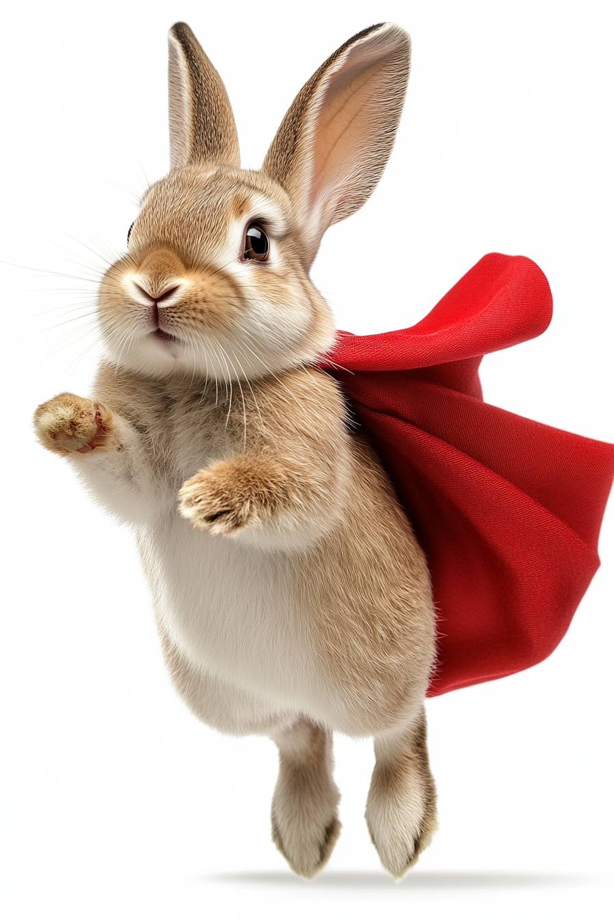 Cute white rabbit in a red superhero cape flying against a blue background, with copy space. This is the winning stock photo from a contest, created in a studio setting. The image shows a full-body side view, with high resolution and very sharp, detailed quality, .clean sharp focus, hyper-realistic, ultra sharp photo, octane render, dramatic light, ,award-winning photo, cinematic lighting, stock photography --chaos 40 --ar 2:3 --style raw --personalize r4pgu9d --stylize 250 --v 6.1