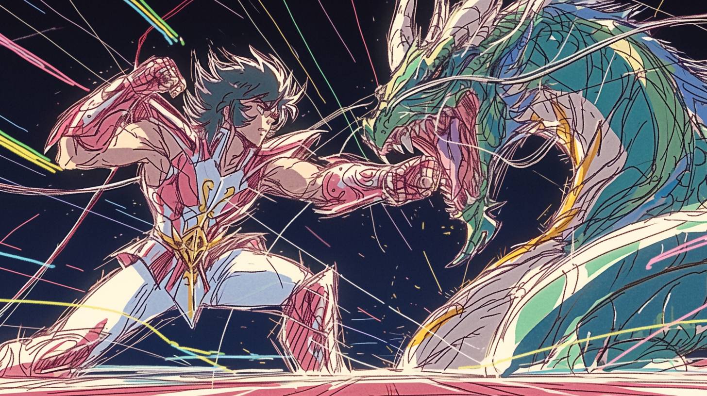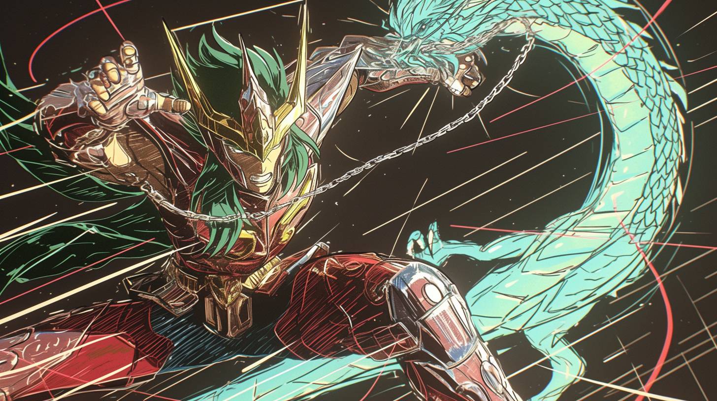 Dragon Shiryu fighting, in the style of hajime sorayama, anime art, Saint Seiya, epic, rtx on, daz3d, animated illustrations, foreshortening techniques, sharp angles, vibrant manga, japanese-inspired --ar 16:9 --style raw --sref 373900453 --stylize 1000 --niji 6