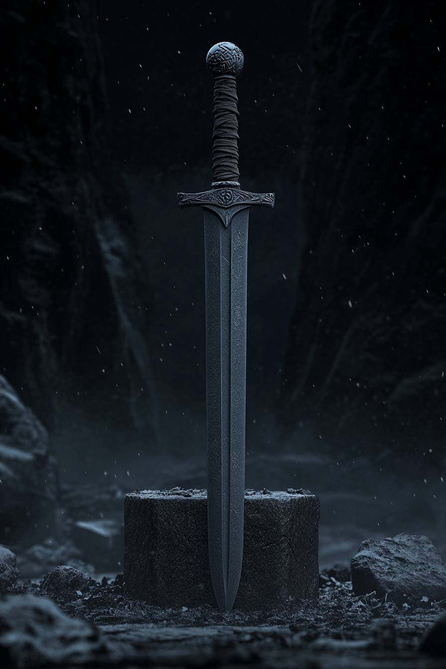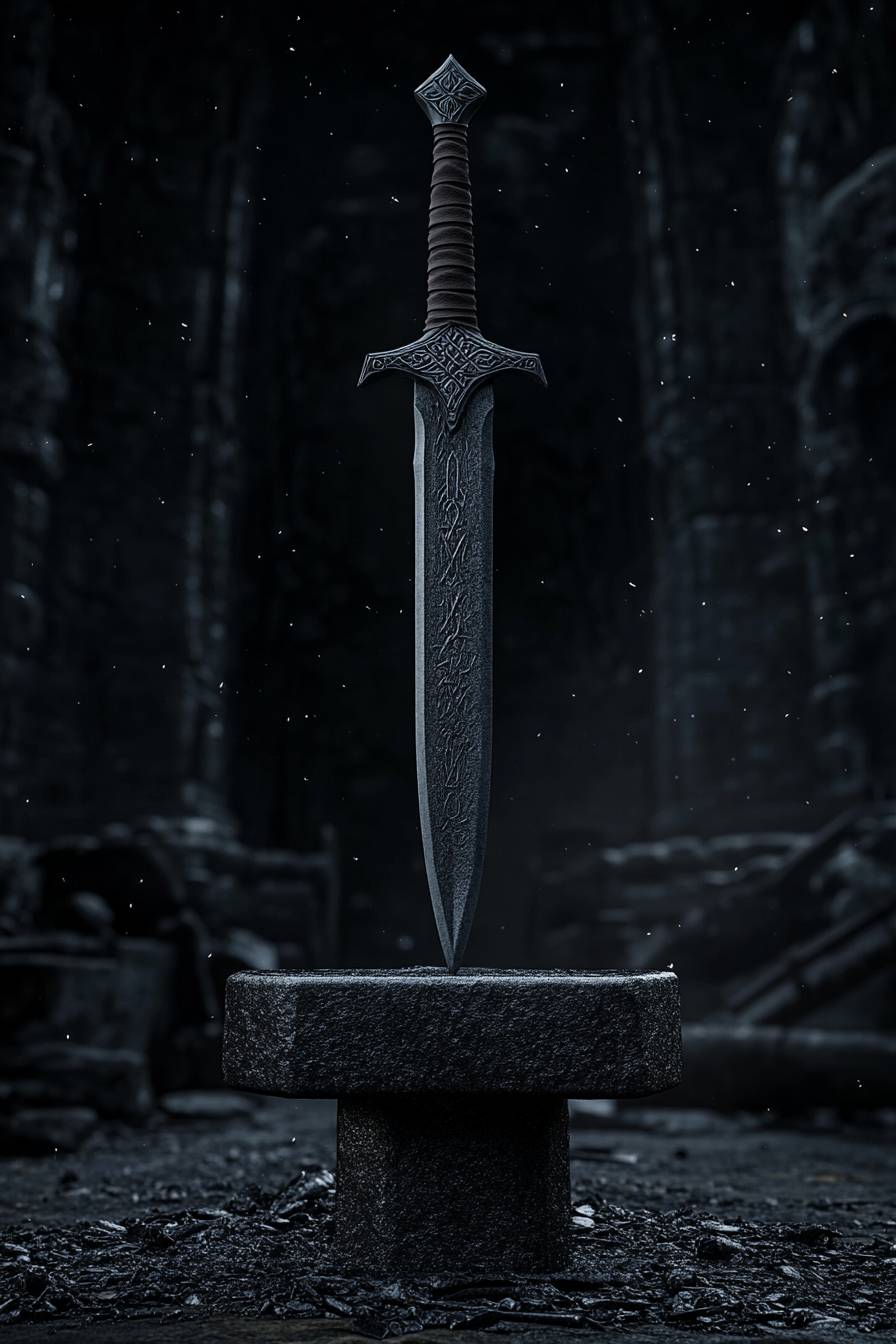 تصوير المنتجات، خنجر دقيق مع مقبض مغلف بالجلد يستريح على أنفيل من العصور الوسطى، يخلق مشهداً لورشة قزم، والكهرمان في الهواء، حيث الفوضى، مغطاة بالحديد والرماد، إضاءة ناعمة، وضوء حاد.
