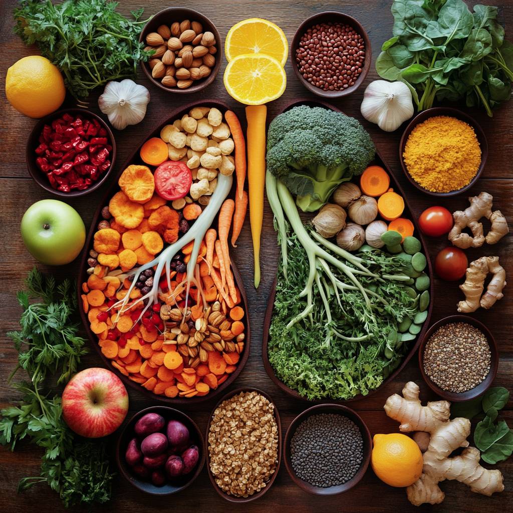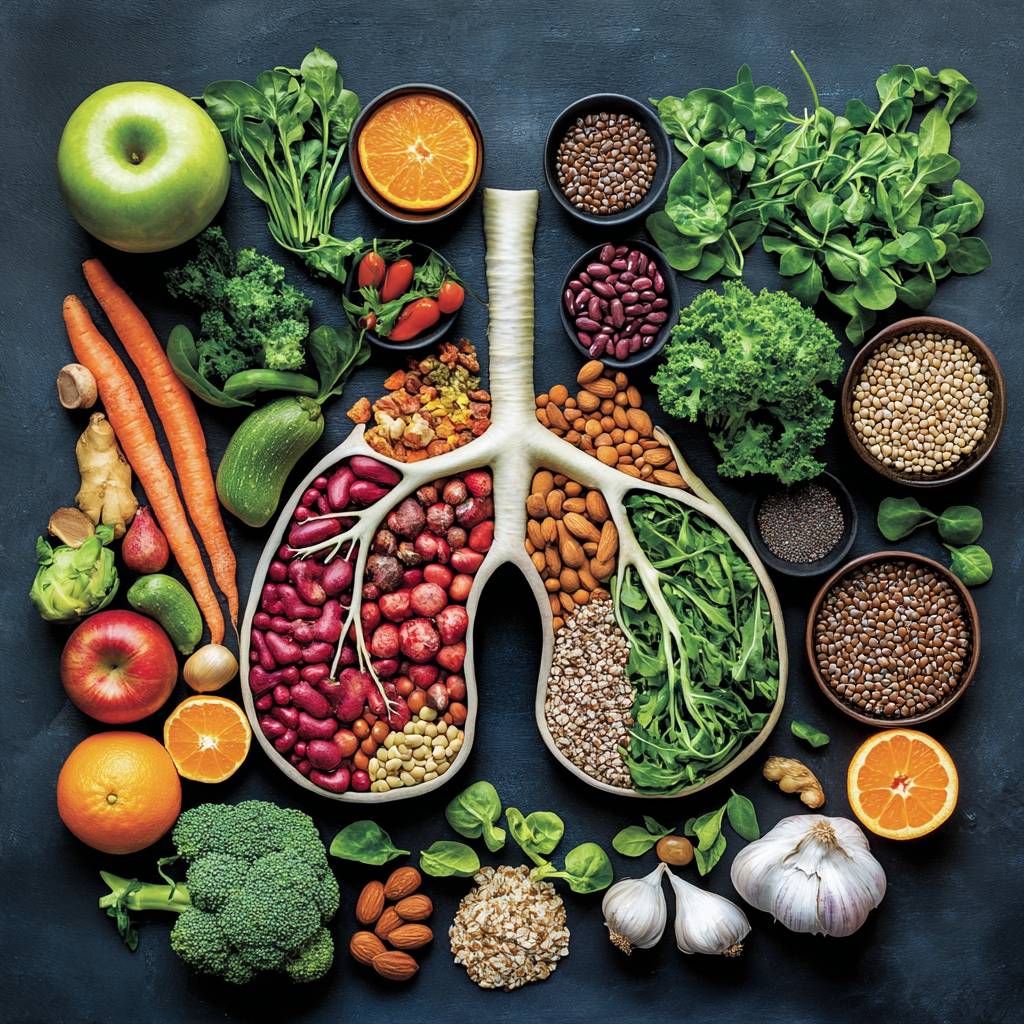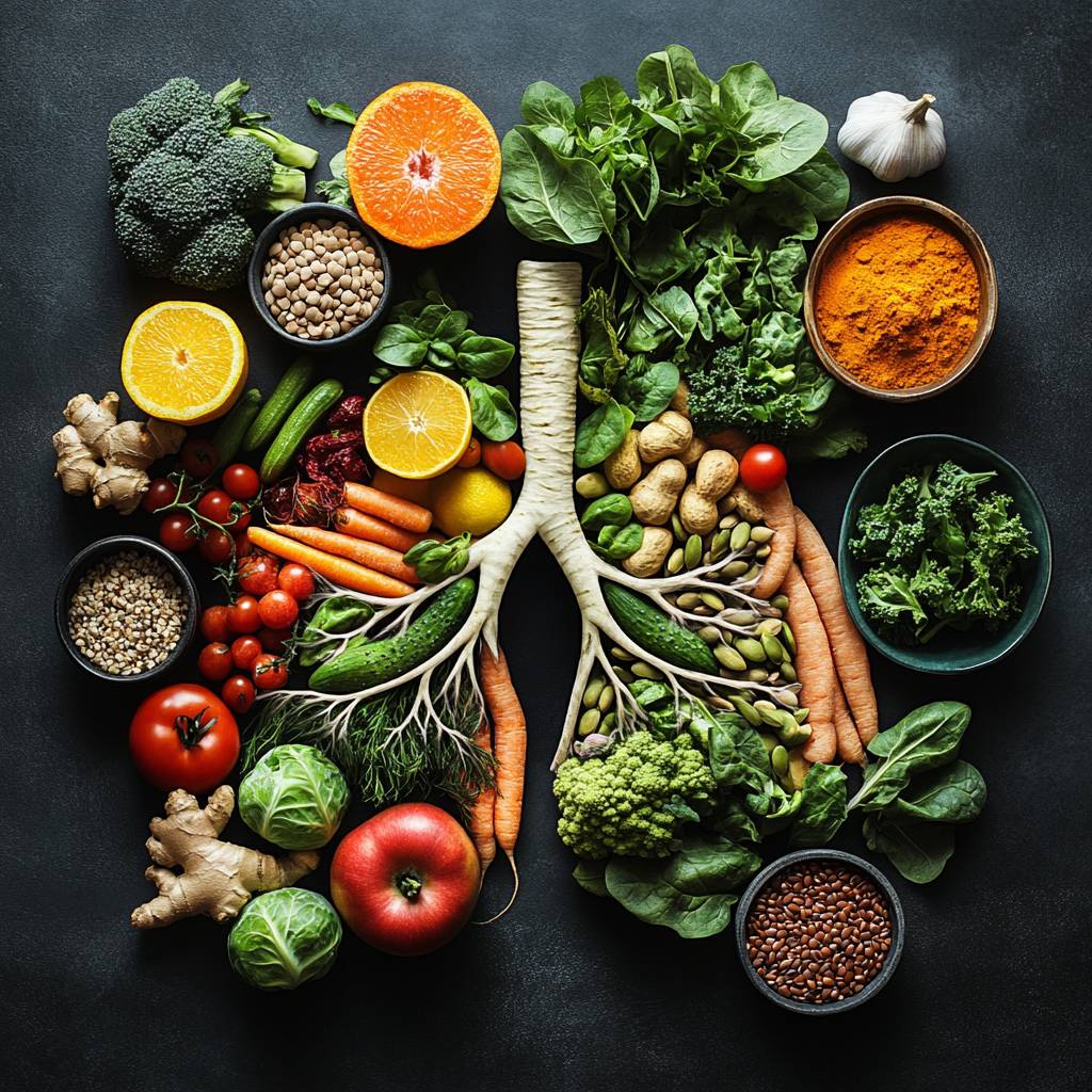 Create an image of lungs. The left lung is mainly made up of foods rich in vitamins, such as colorful fruits and vegetables: apples, carrots, tomatoes, oranges, lemons, red peppers, sweet potatoes, spinach, and nuts. The right lung is primarily composed of green vegetables and foods rich in omega-3, such as broccoli, cauliflower, Brussels sprouts, spinach, beans, salmon, mackerel, and sardines. Surrounding the lungs are bowls of spices, seeds, and legumes, such as turmeric, ginger, lentils, flax seeds, Brazil nuts, and garlic. The arrangement and colors of the foods should evoke a sense of health and well-being.