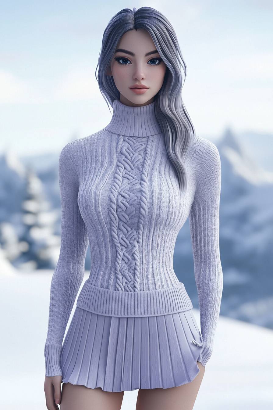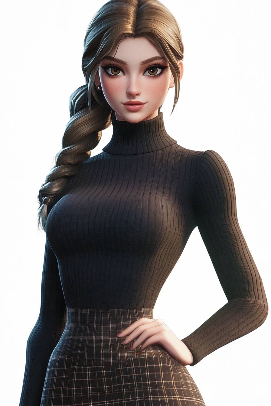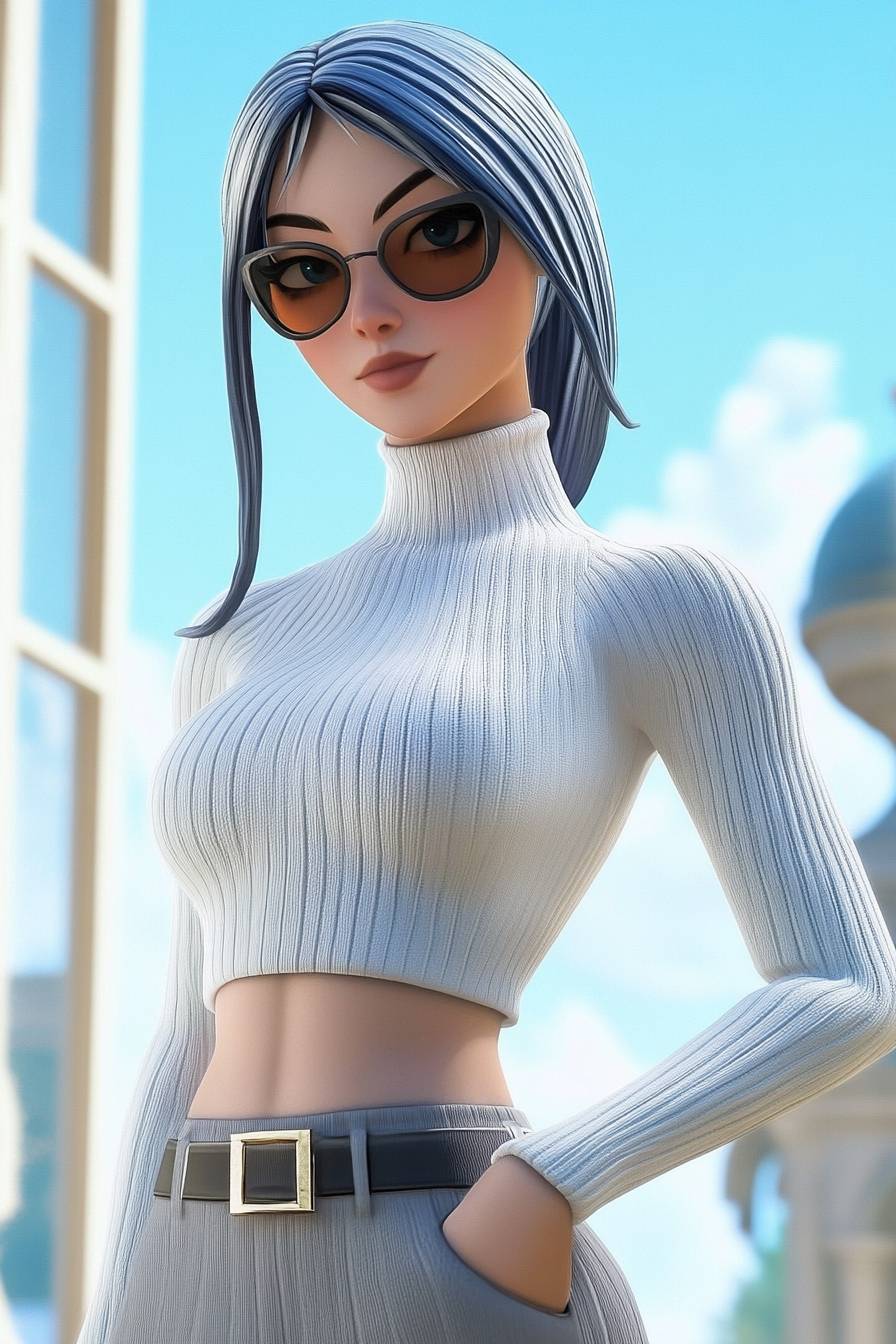 سيدة أنيقة ترتدي سترة ضيقة ذات عنق مرتفع وتنورة، أسلوب فورتنايت
