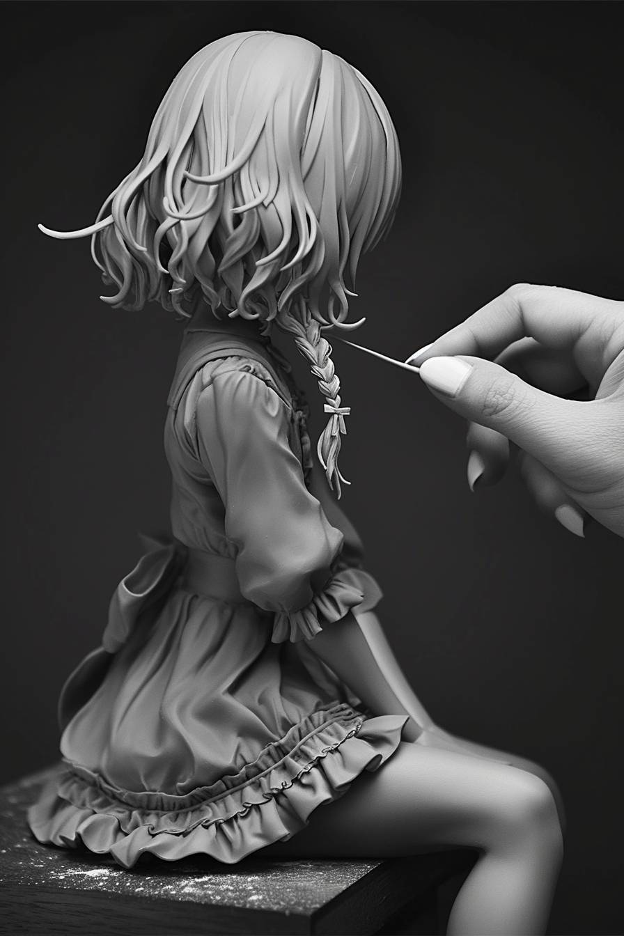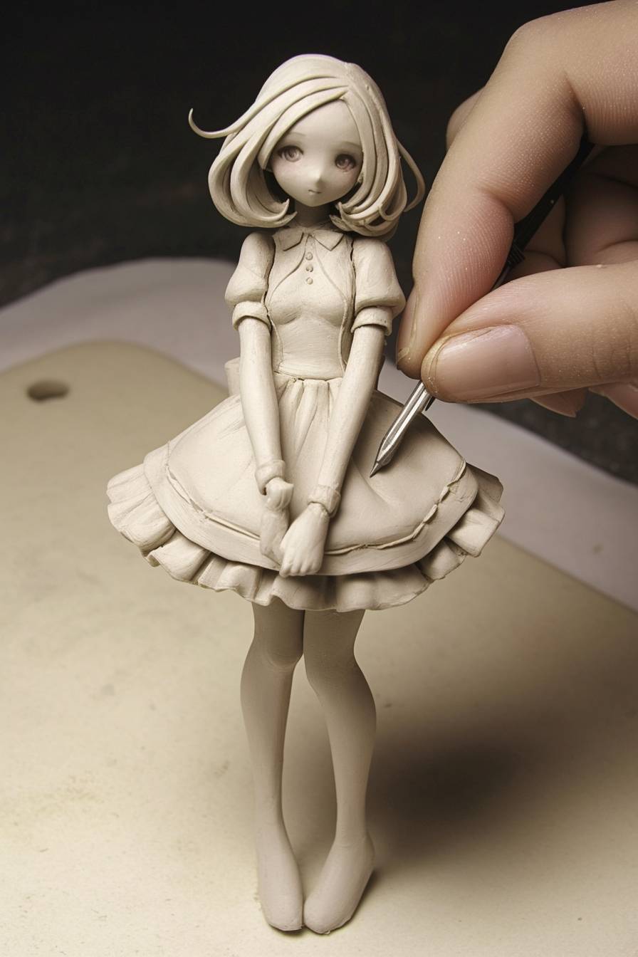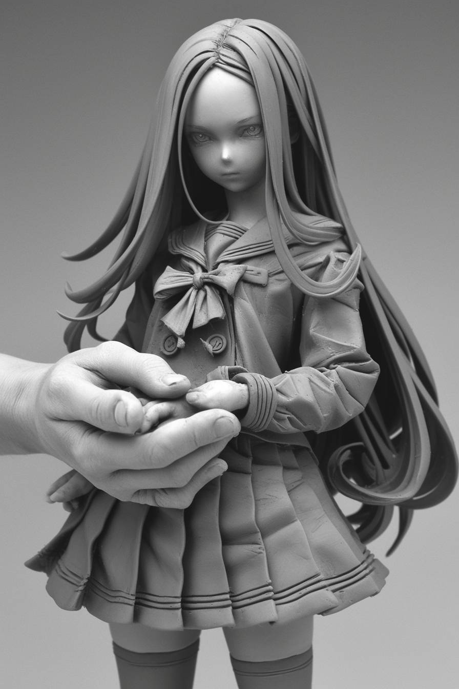 Precision clay realistic model, monochrome clay, realistic anime girl character, action figure, Human hand supporting the doll, clay accessory --ar 2:3 --style raw --stylize 200 --niji 6