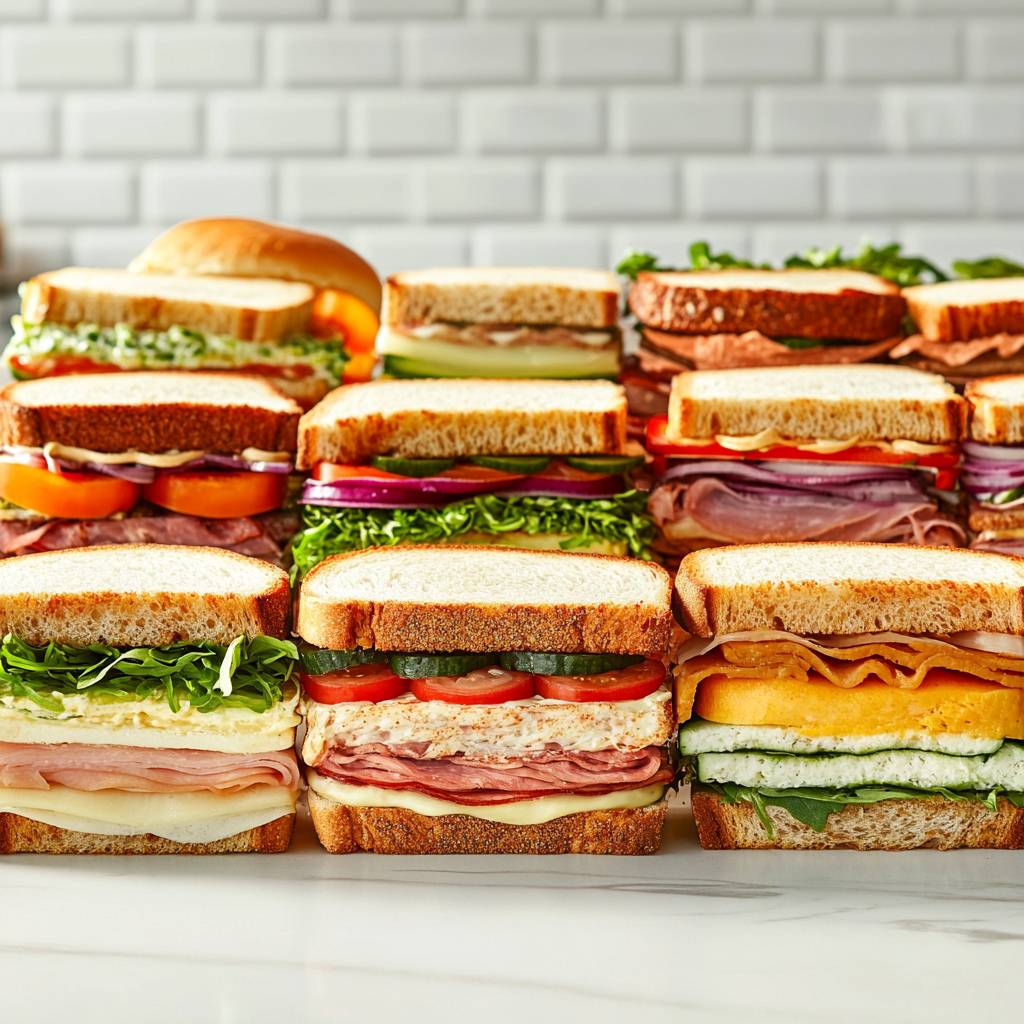 Realistic photograph of a lot of differentes sandwiches in the kitchen's table. VERY colorful photo. Product photography on a white countertop to highlight the colors of the sanwcih. --v 6.1