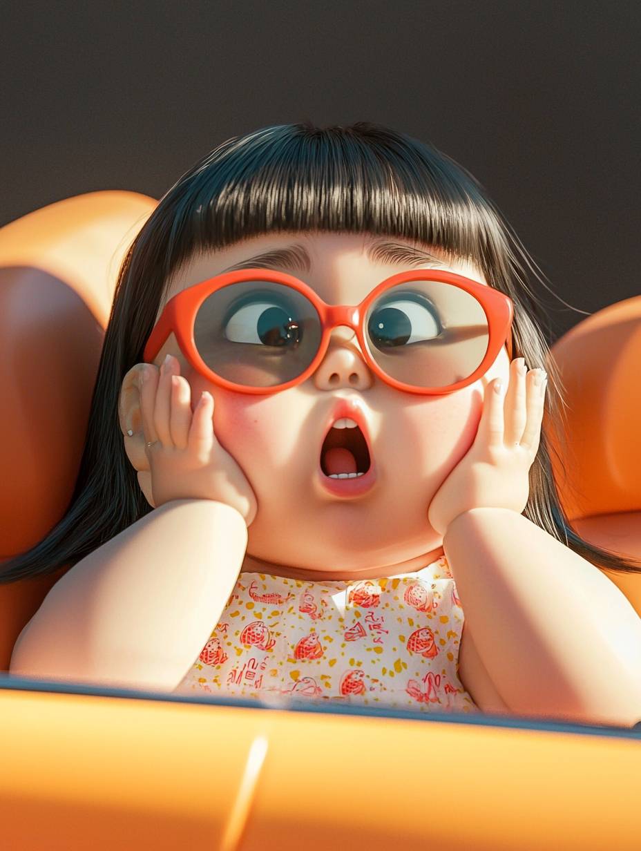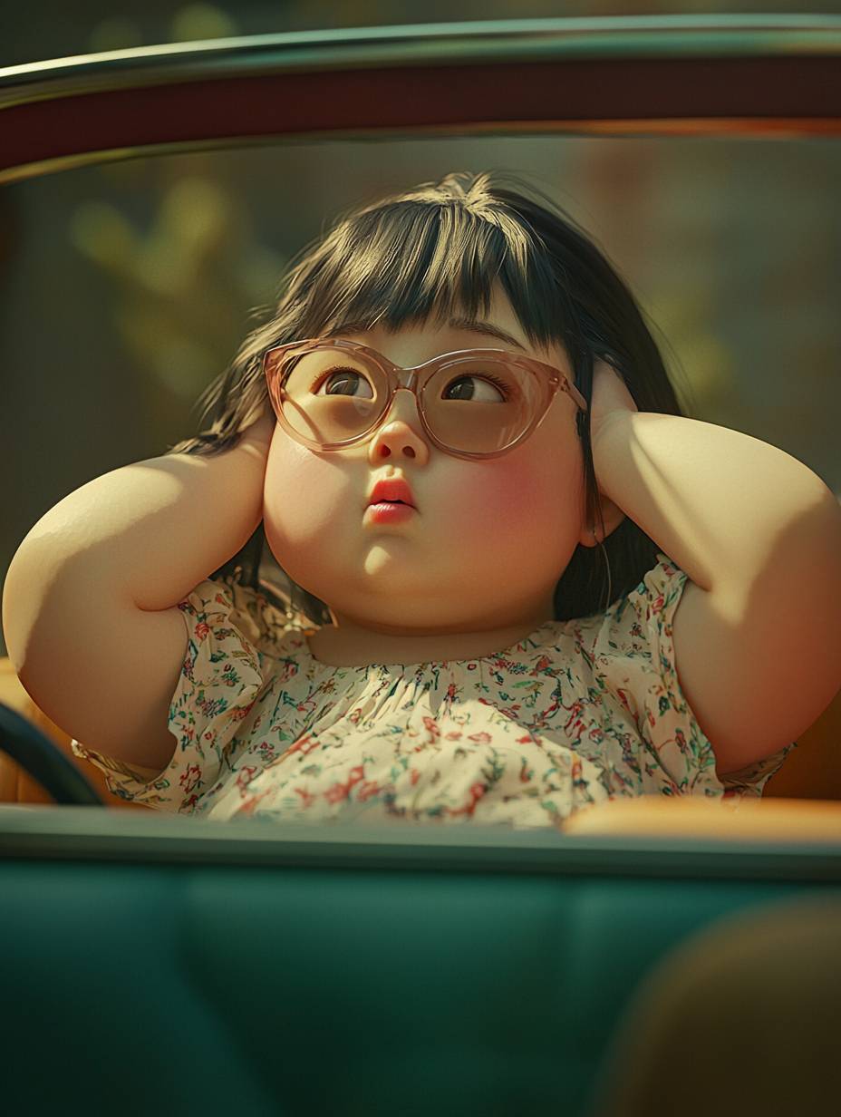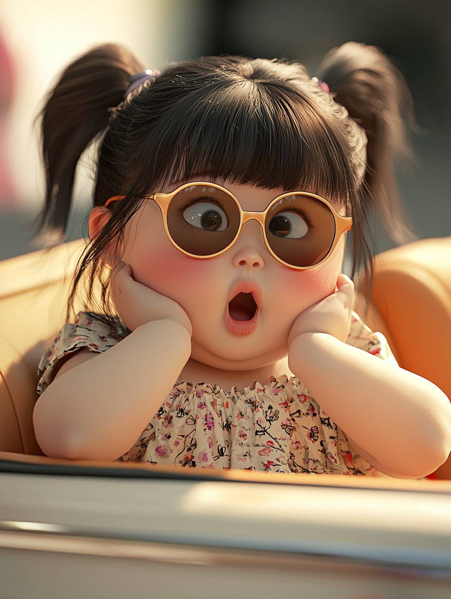 A chubby little Chinese girl sits in a convertible, resting her face on her hands, looking into the distance. She has a round face, plump limbs, an exaggerated surprised expression, cute hair, wearing sunglasses, a half-body portrait, dressed in a dress, with a clean background, high quality, super angled dynamic pose, dynamic angle, 16k, ultra-clear details, octane rendering., --ar 3:4 --quality 2 --stylize 48 --v 6.1