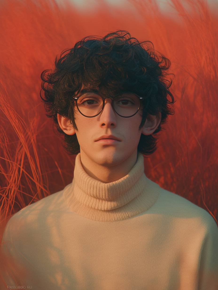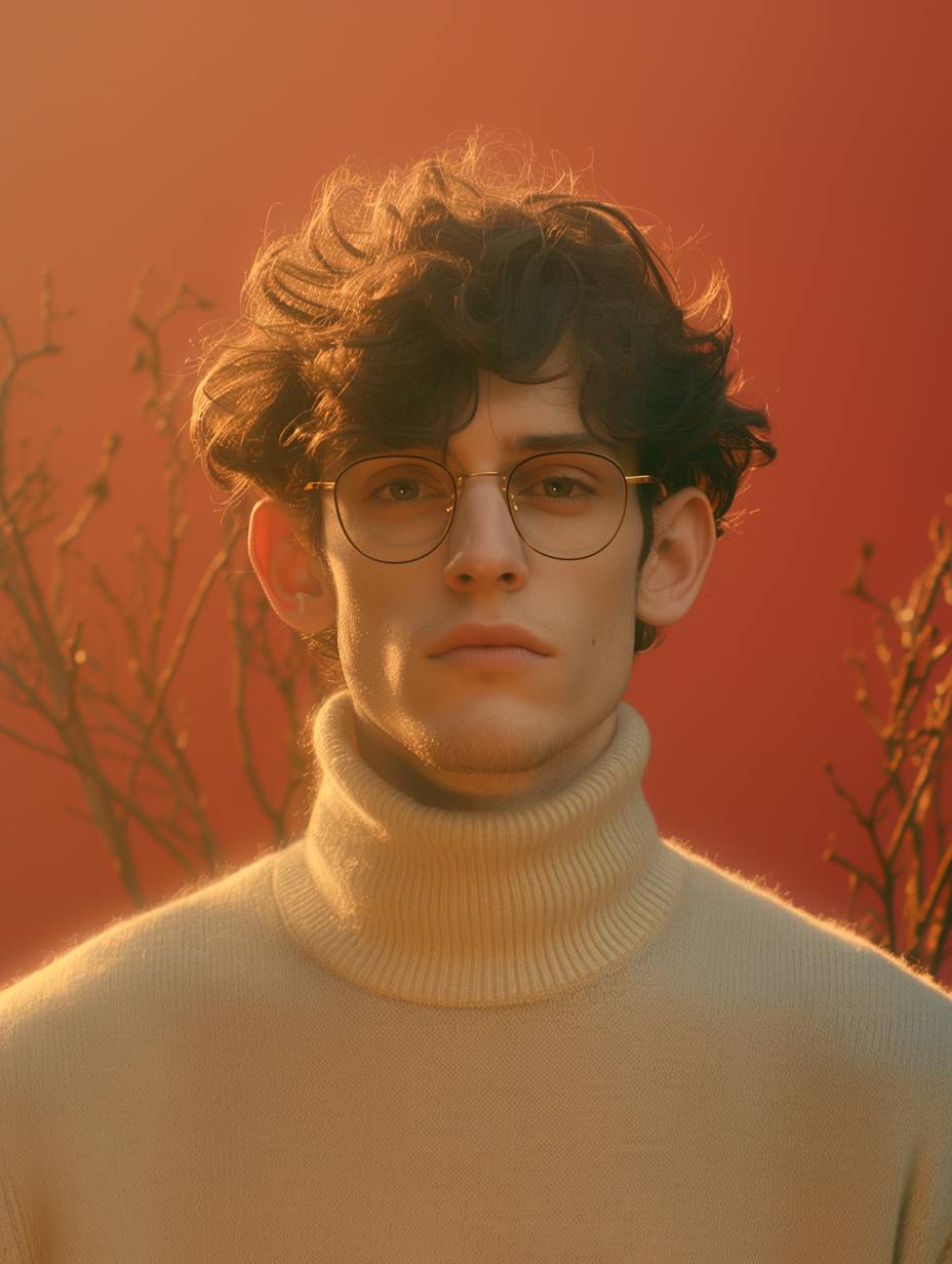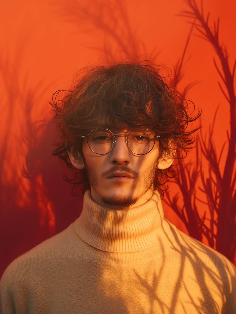A man with dark brown curly hair, glasses, and an off-white turtleneck sweater, with sunlit willows dancing in the breeze behind him, has thin eyebrows, clear features, and no stubble. The background is colored in red to indicate melancholy and sadness, creating a cinematic feel. This photo is a full body portrait of him taken with a cell phone camera in a style that is supposed to be surreal with sharp details. --ar 3:4 --niji 6