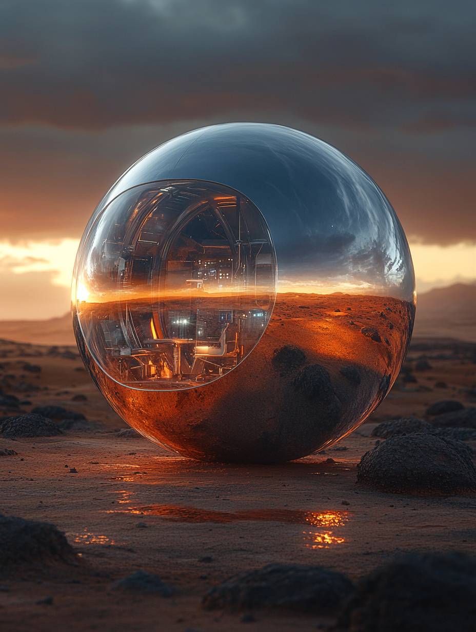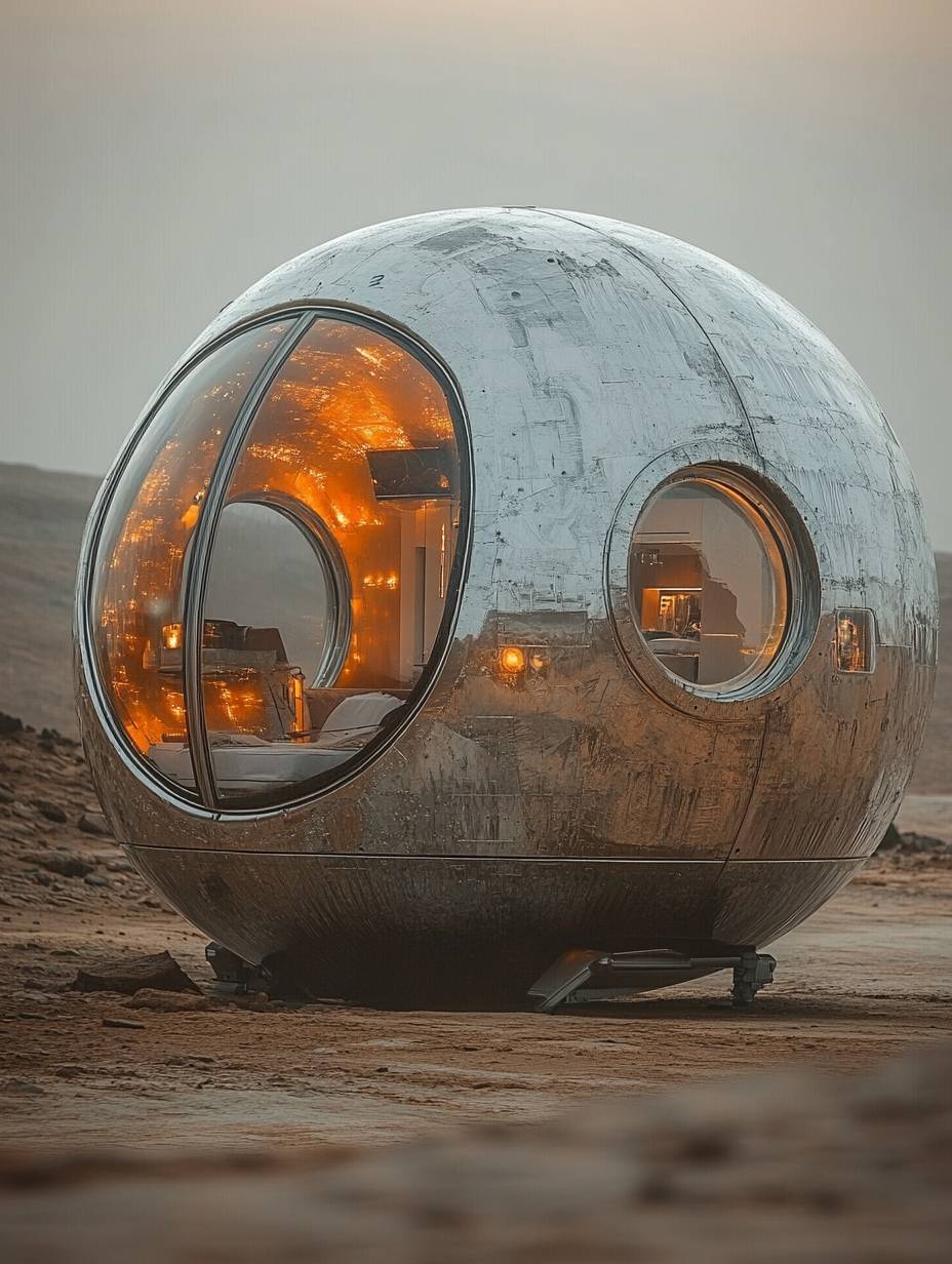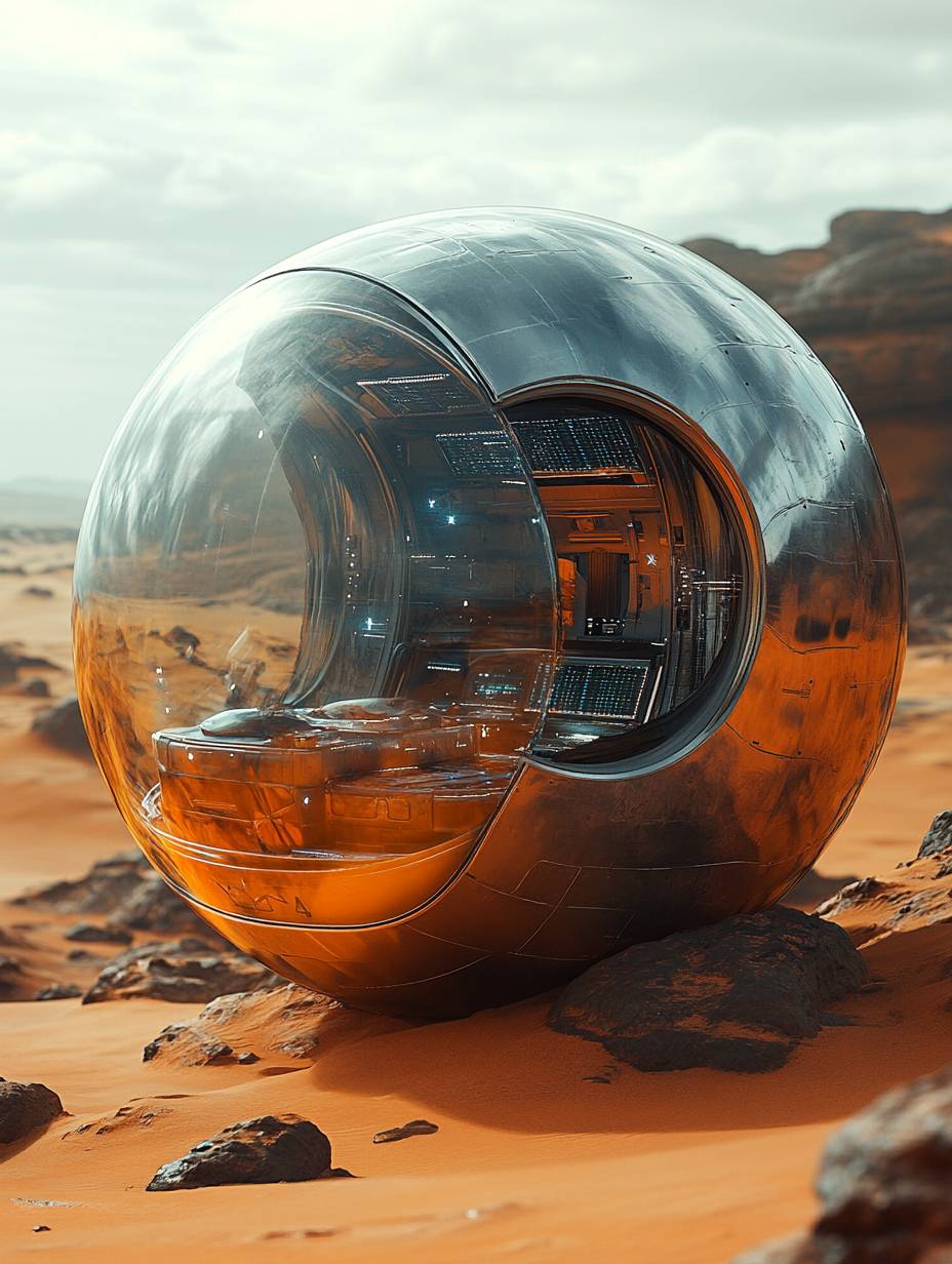 كبسولة كروية مستقبلية مصممة كمنزل جوي مستقل على كوكب المريخ. التصميم انسيابي، مستقبلي، مستوحى من معدات رواد الفضاء، مغطاة بكريستال عاكس. الكبسولة موجودة على المريخ، تعرض أنظمة دفع متقدمة. تسليط الضوء على التفاصيل الدقيقة مثل الألواح الشمسية، وإعادة تدوير الأكسجين، والديكورات الداخلية minimalist المرئية من خلال النوافذ الشفافة. التقاط جوهر تكنولوجيا استكشاف الفضاء المدمجة في الحياة الحديثة، مع كثبان المريخ في الخلفية.