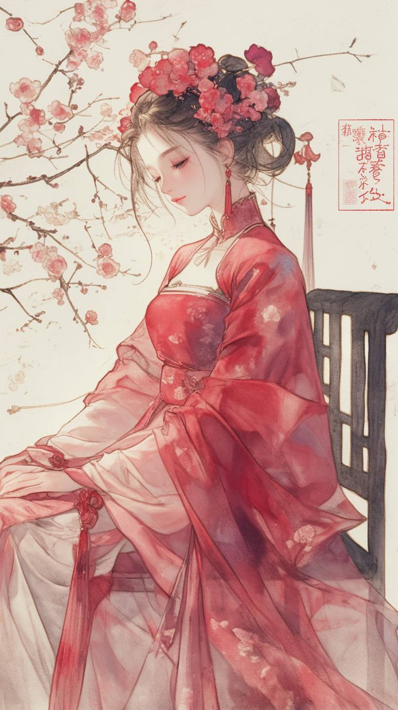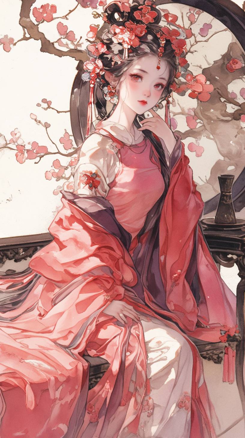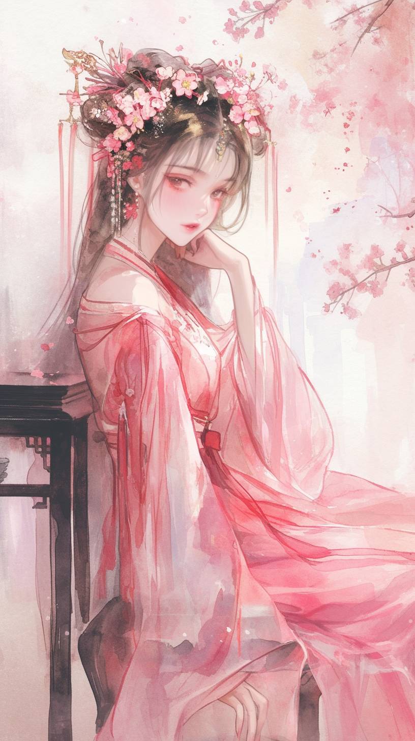 فتاة صينية ترتدي هانفو وردي وزهرة في شعرها جالسة في غرفة ذات طراز قديم، ترتدي فستانًا رائعًا وتنورة دائرية. الخلفية عبارة عن ورق أبيض مع رسومات مائية لزهور الكرز المتفتحة، وملامح وجهها رائعة وزينة شعرها رقيقة. وجهها يشع بضوء ناعم مما يخلق جوًا حالماً. بجانب الكرسي توجد طاولة خشبية سوداء.