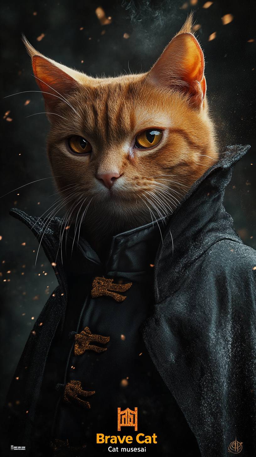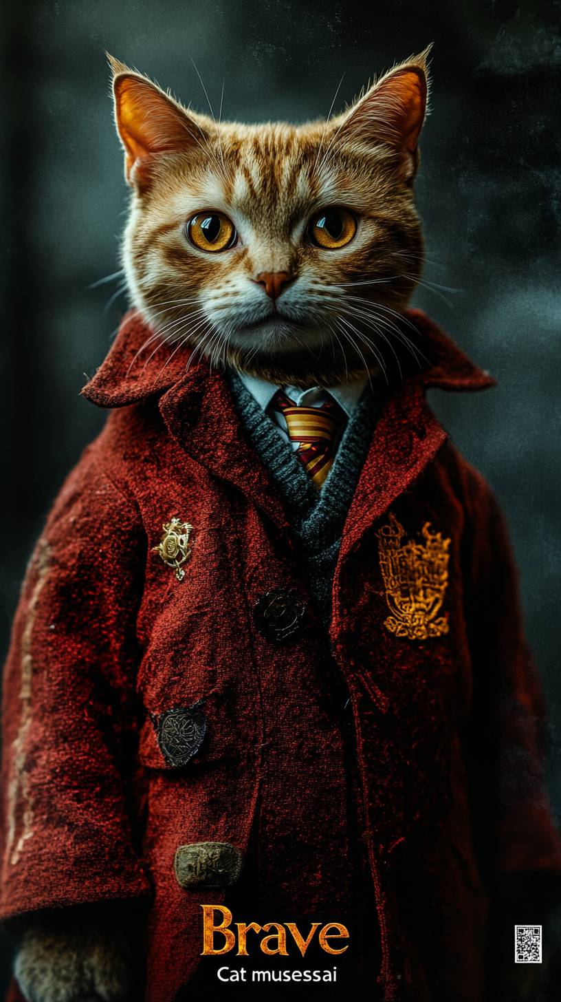 ملصق فيلم هاري بوتر الذي يتميز بوجه يشبه وجه القطط، يرتدي زي هوجوورتس، بعنوان 'القط الشجاع' مع نص 'musesai' باللغة الصينية، يتميز بأسلوب تصوير فائق الواقعية، لقطات من الفيلم، وموضوع عيد رأس السنة الصينية، تم تصويره بكاميرا كانون EOS R5 مع فتحة عدسة F2 وISO400.