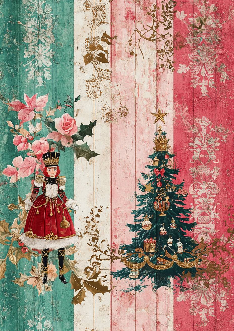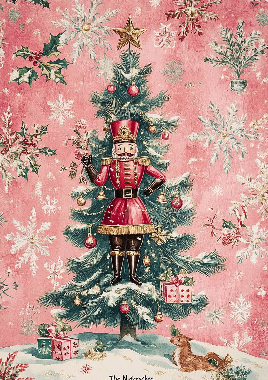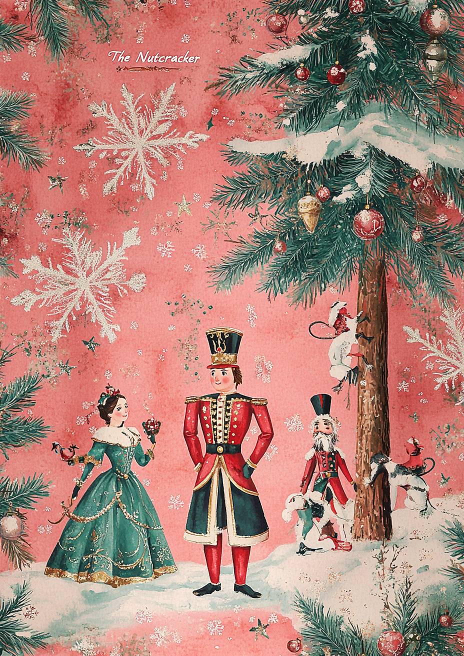 Christmas pink , red , green and white themed scrapbook paper with a vintage cartoon The Nutcracker Prince: The hero of "The Nutcracker" ballet, who comes to life from a wooden nutcracker to battle the Mouse King and transport Clara to a magical land filled with sweets. In the style of Stamperia. Tiled design. Watercolor background. --ar 5:7 --stylize 250 --v 6.1