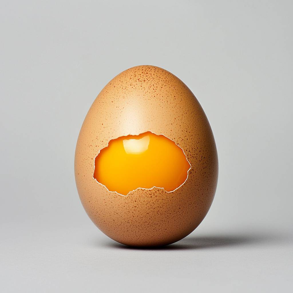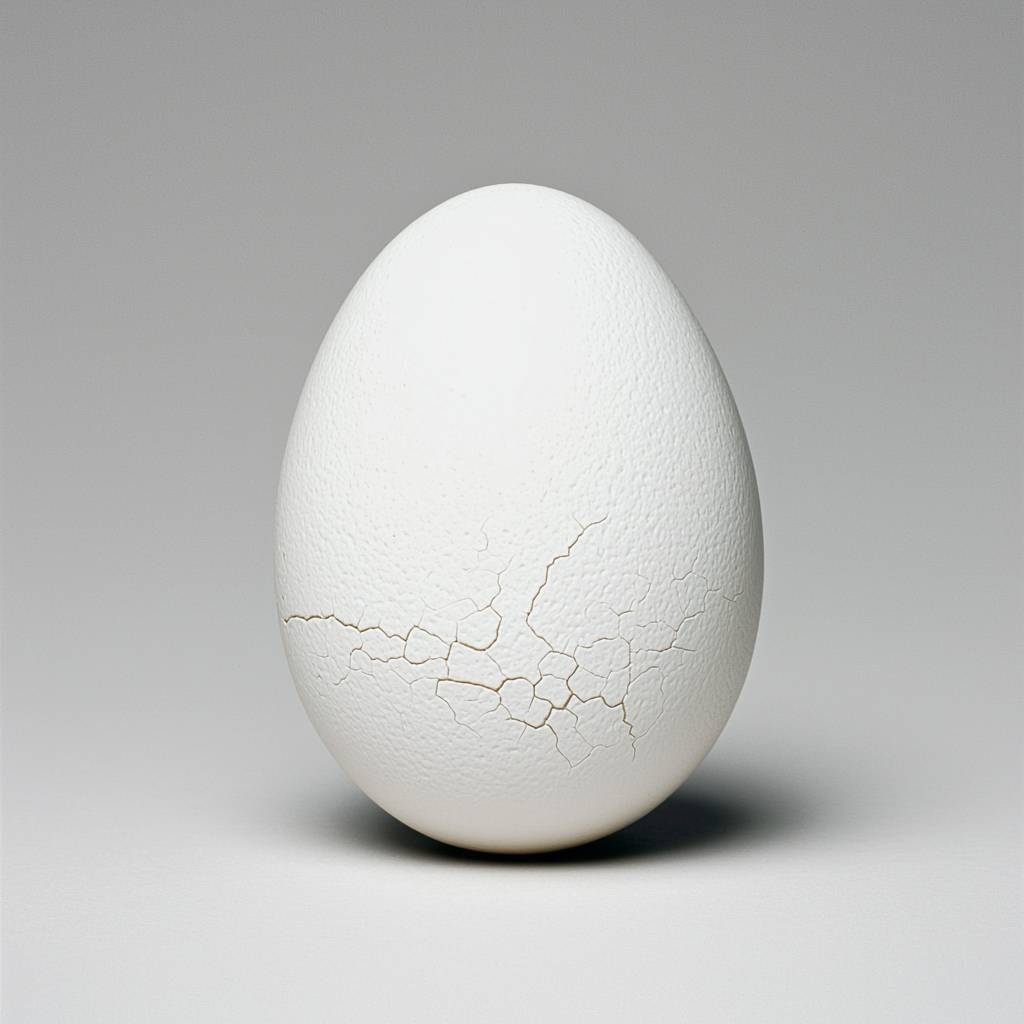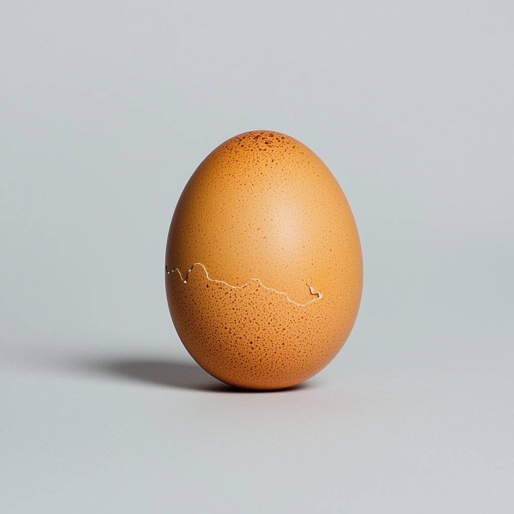 A single cracked egg lying on a barren surface, symbolizing the fragility of life, on a plain gray background. --ar 1:1 --quality 2 --style raw --personalize j9419xr --stylize 750 --v 6.1