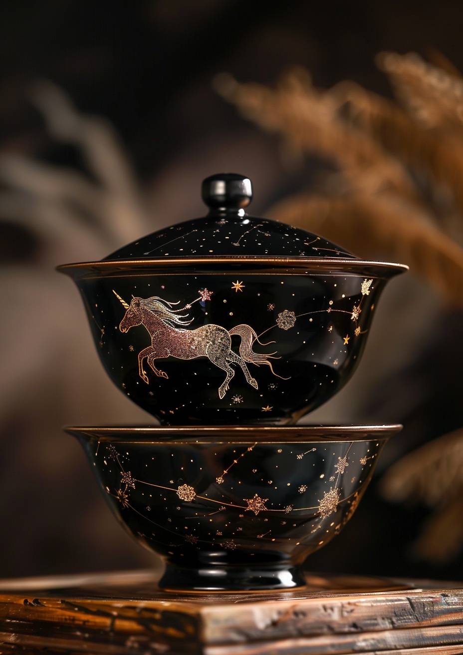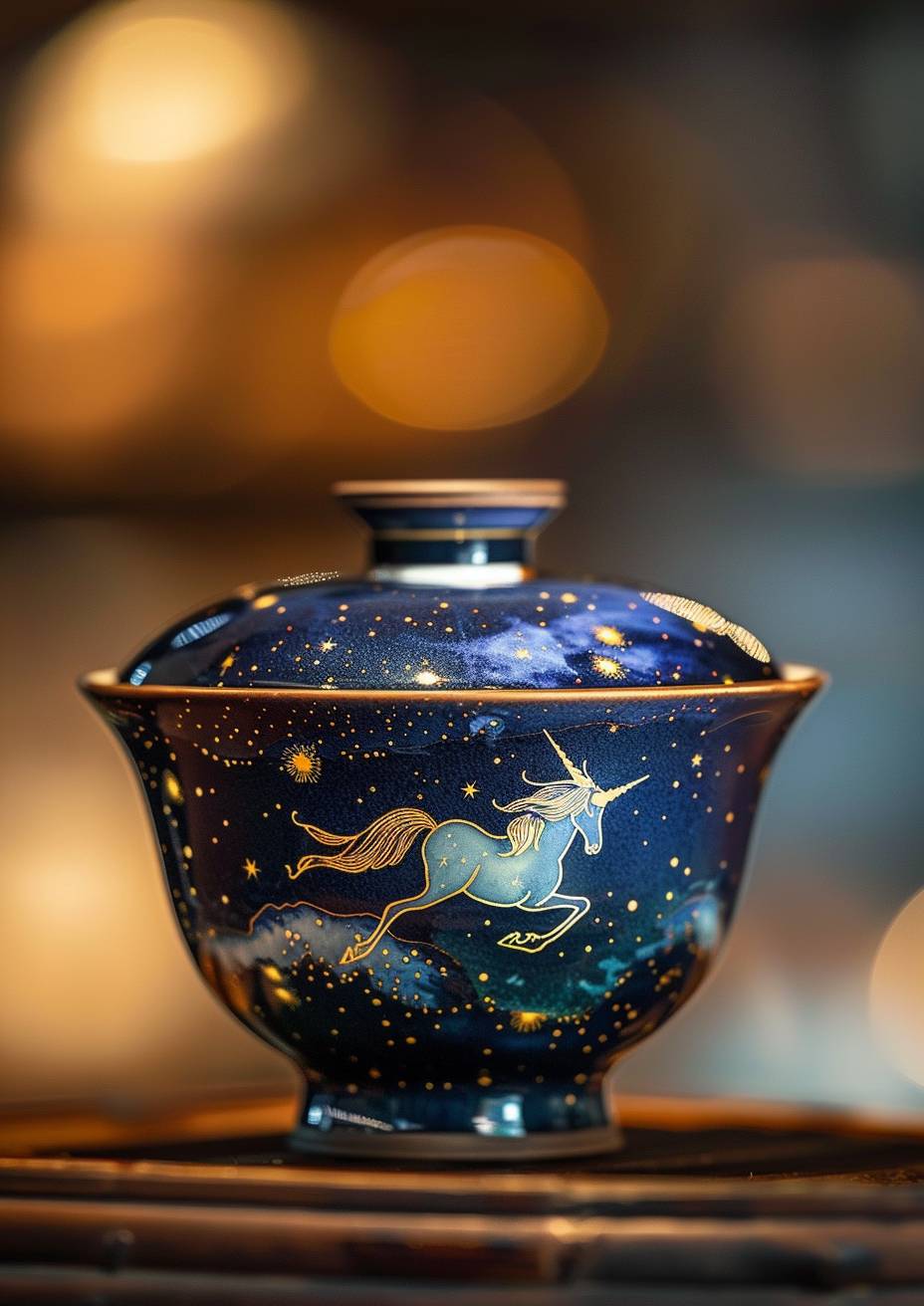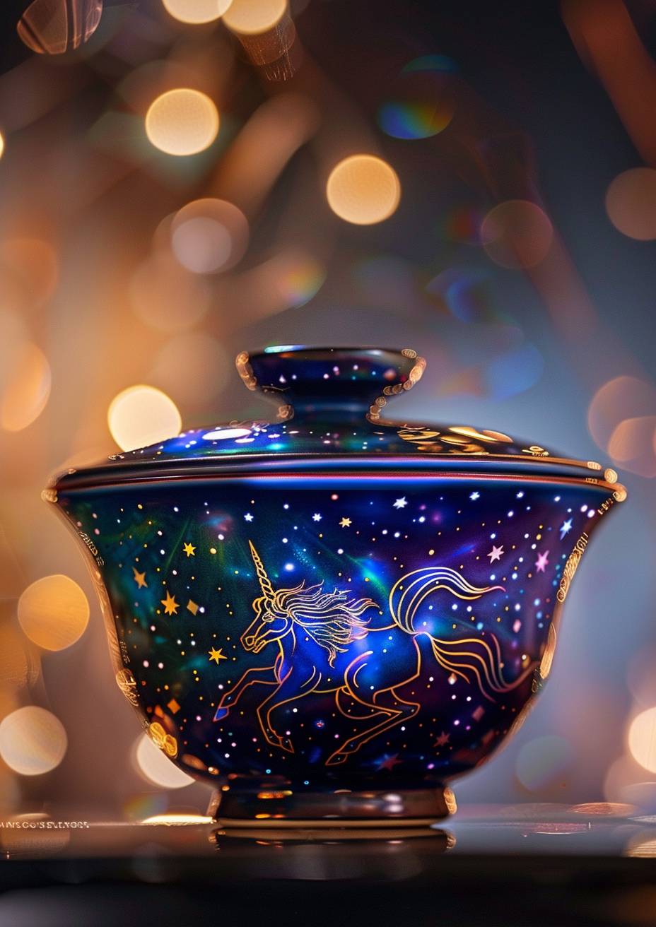 a gaiwan lidded bowl, dark ceramic, decorated with a spectral zodiac unicorn running through stars. monoceros constellation, tenebrism, glowing points of light, bokeh background --ar 5:7 --v 6.0