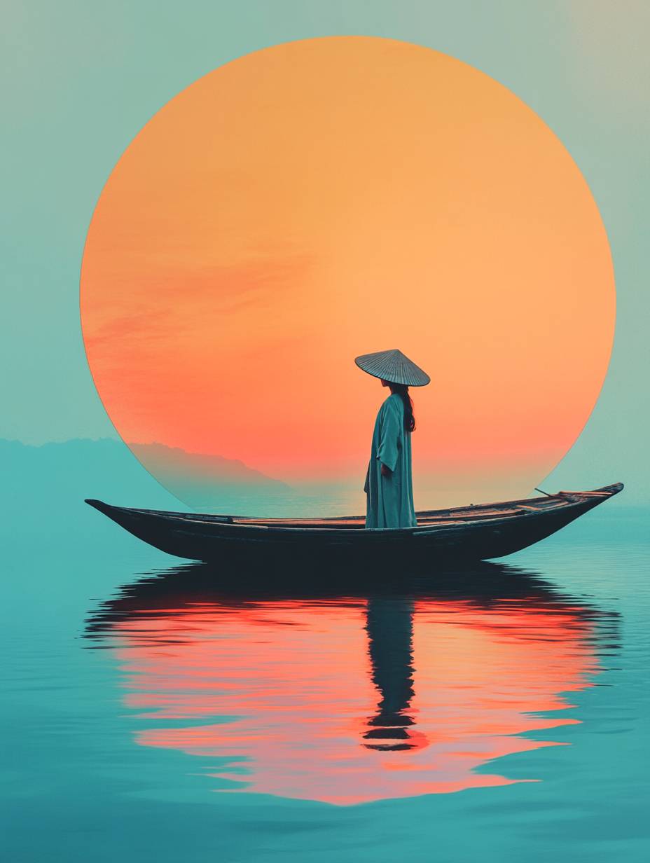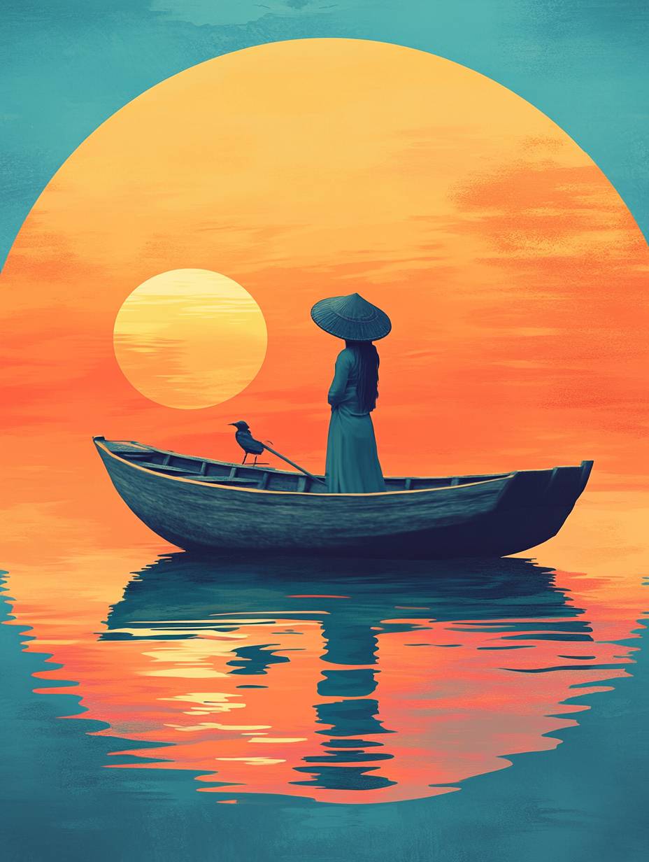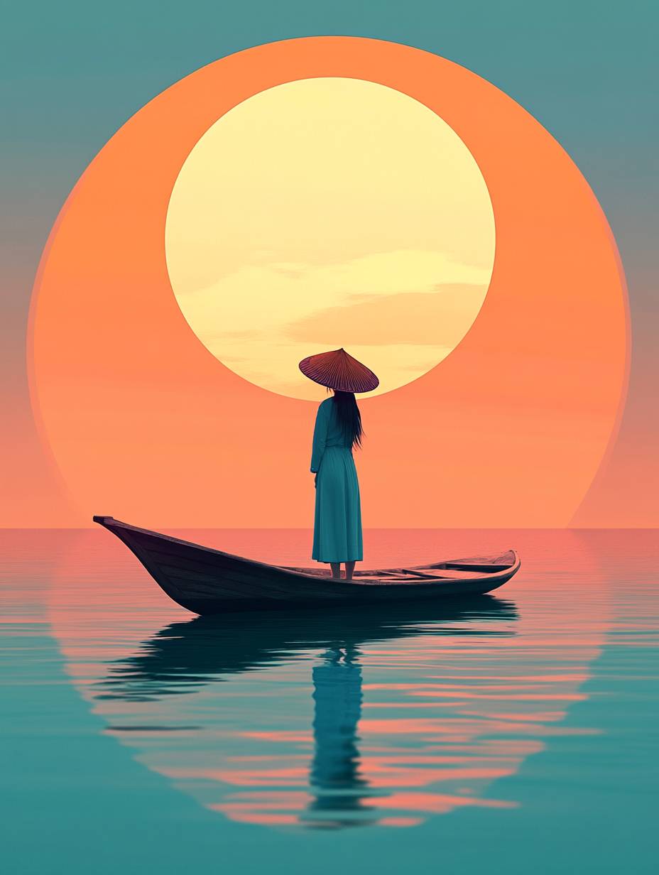 Poster, circular pattern, bright colors, background of Chinese and American girls on board, sunset in the sky, gradient blue to orange background, digital art style, simplicity, high resolution, symmetrical composition, colorful, vibrant light and water reflection effect. A woman in a traditional Chinese hat stands on a small wooden fishing boat watching the sunset over the calm waters. --ar 3:4 --v 6.1
