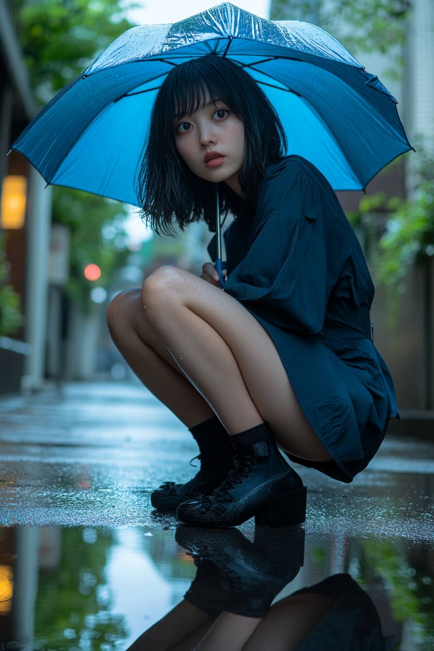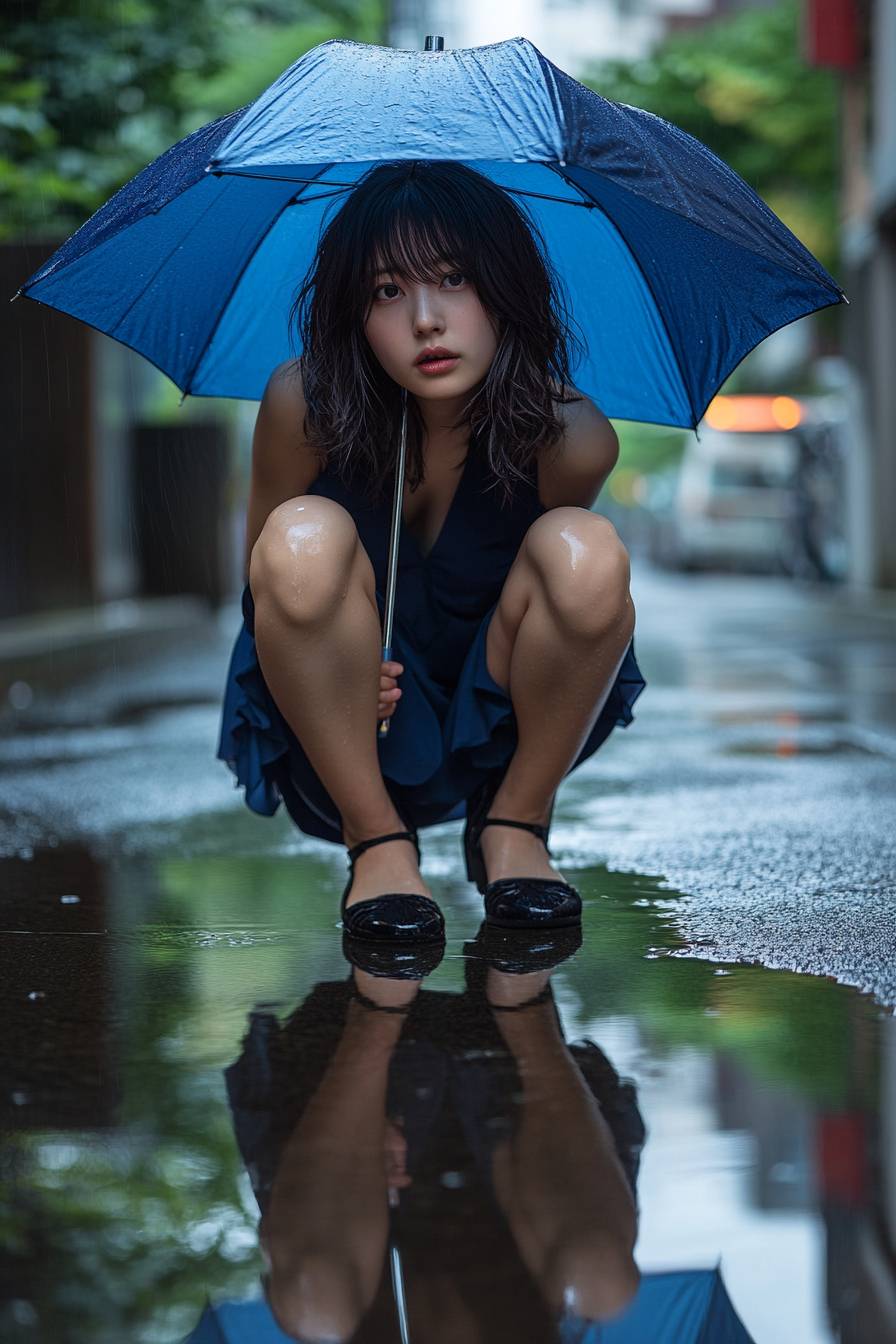 امرأة يابانية ذات شعر داكن يصل إلى الكتف في وضع القرفصاء تحت مظلة زرقاء. ترتدي فستانًا أزرق داكنًا وأحذية منصات سوداء، في بيئة حضرية بشوارع رطبة نتيجة للأمطار الأخيرة. ينعكس صورتها تمامًا في بركة تحتها، مما يضفي عمقًا على التركيبة. الخلفية تحتوي على أوراق خضراء ناعمة ومباني حضرية مخففة، مما يخلق أجواءً هادئة ولكن كئيبة. الإضاءة م diffuse، مما يعزز المزاج الانعكاسي والهادئ لمشهد يوم ممطر.