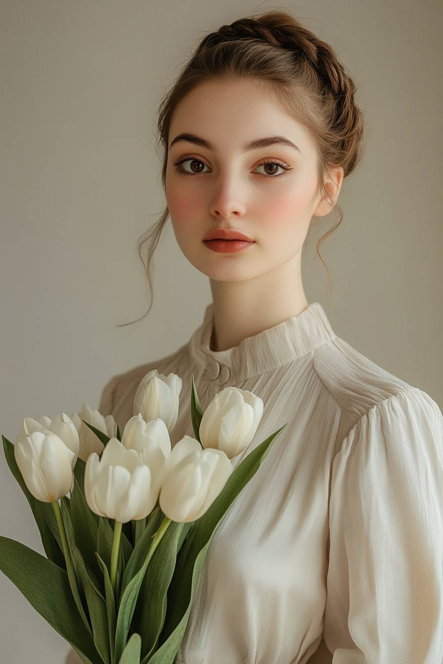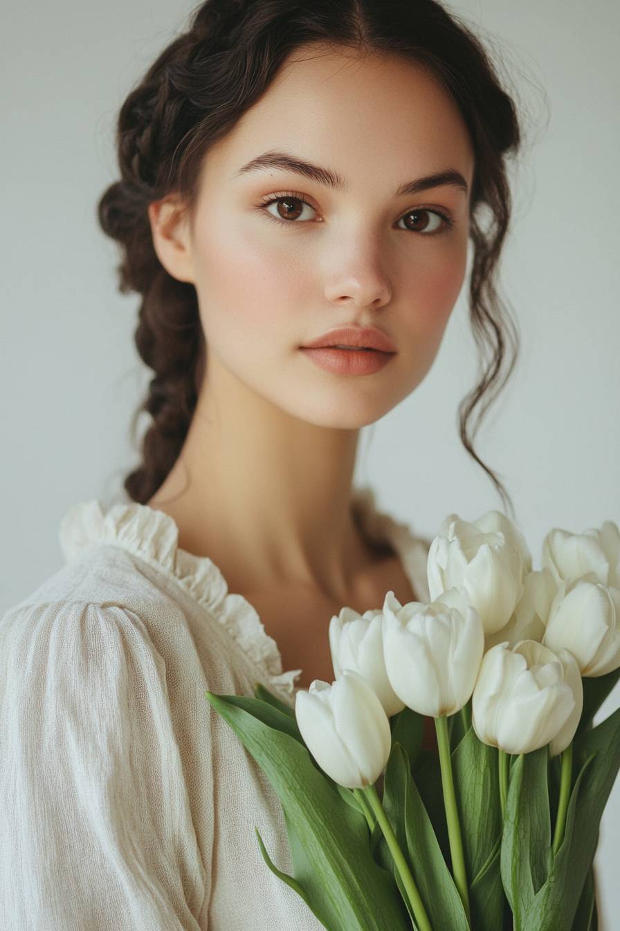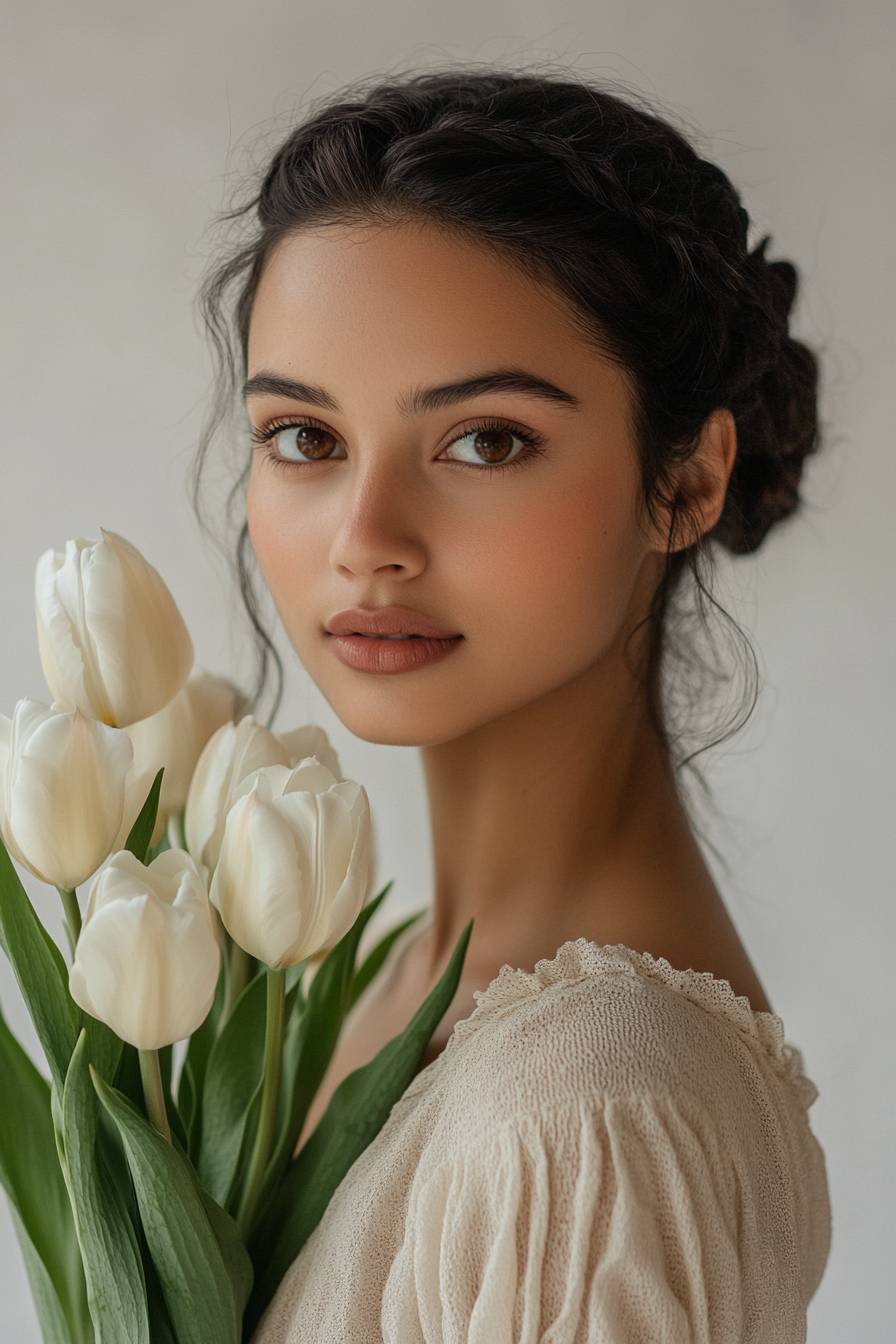 Portrait of an elegant woman holding white tulips, wearing a light blouse and her hair in a braided bun, looking at the camera with beautiful brown eyes, standing against a plain background. High-resolution photography, realistic photo, natural lighting, in the style of Canon EOS R6 Mark II Mirrorless. --ar 2:3 --v 6.1