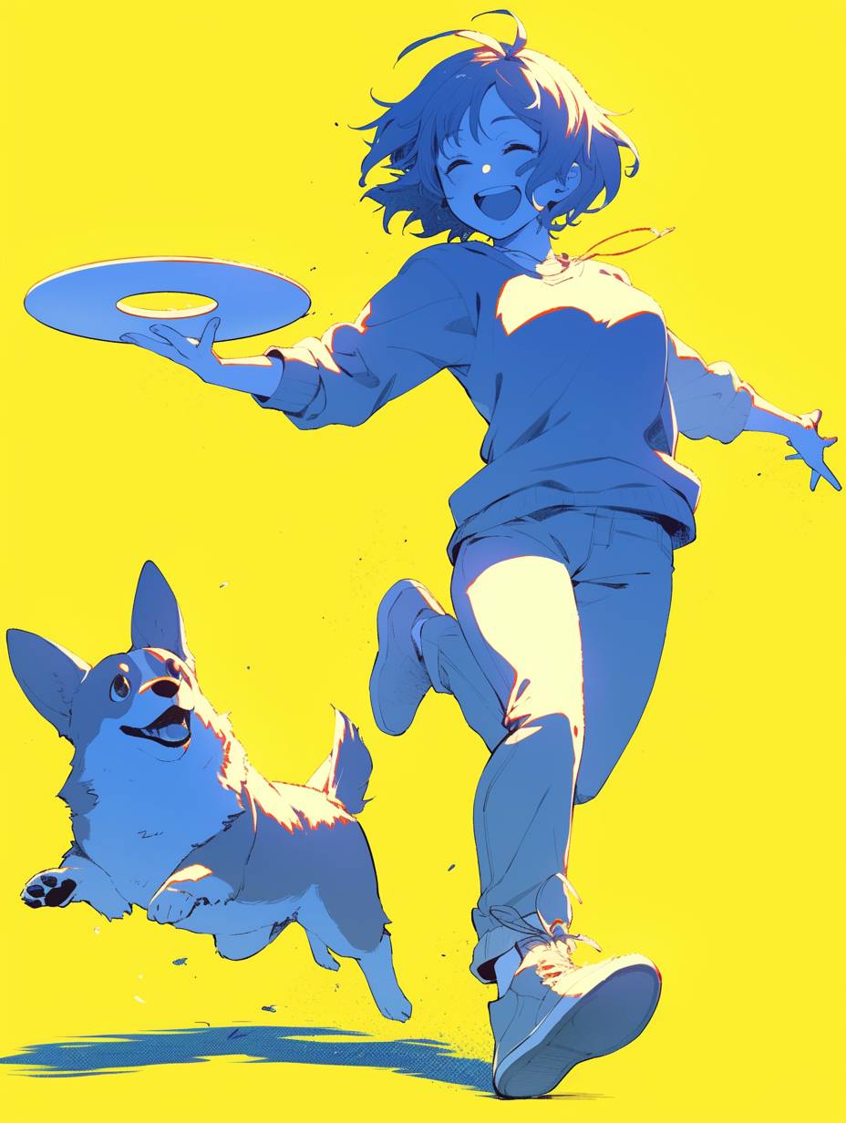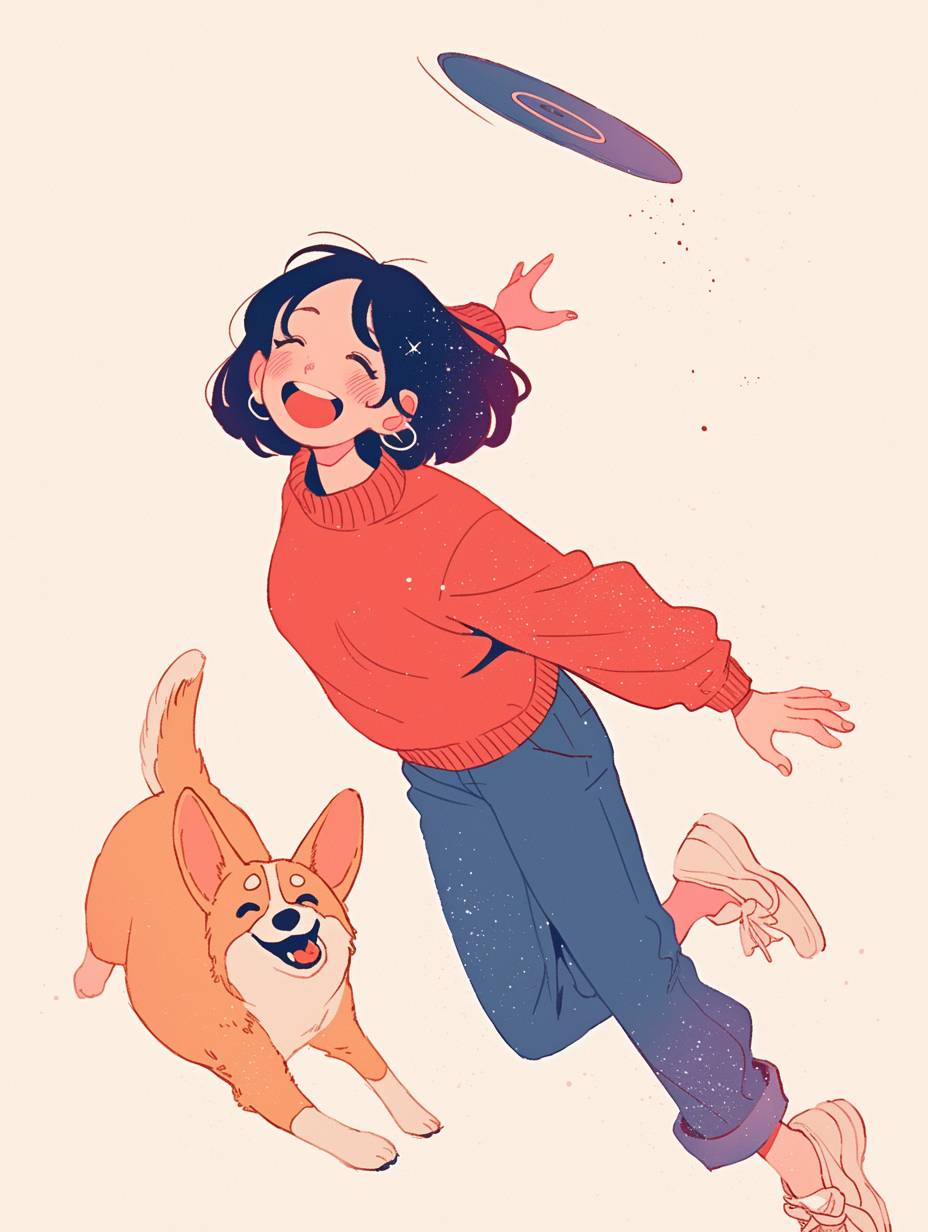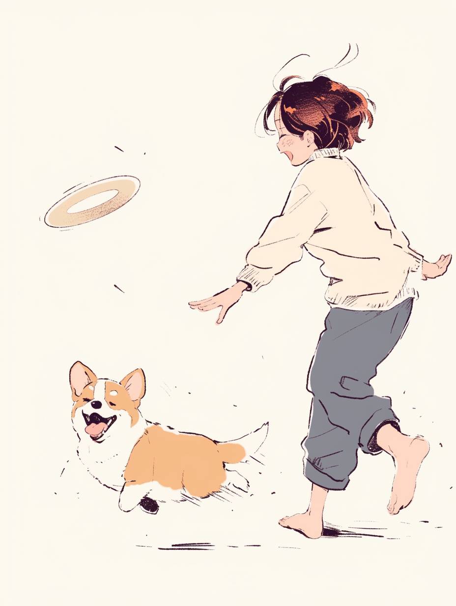 A short-haired woman, wearing a sweater and pants, taking a step, throwing a Frisbee, laughing happily, a running corgi beside her is catching the Frisbee, full body composition, front composition, illustration style --ar 3:4 --niji 6