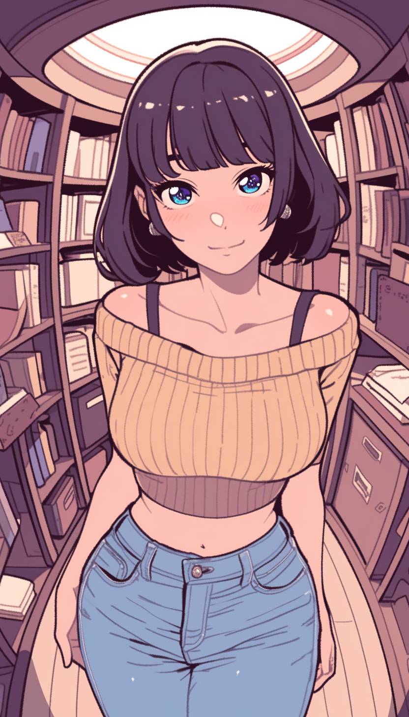 Today is 3 November 2024. Located in Tokyo, Kanto region, Japan. Feel free to draw this picture according to your mood today. The protagonist is a 25-year-old woman. She is 155-165 cm tall and has a good style. She is actually a hero and protects the world around midnight. And she is actually an android, although she almost looks like a person. There are several other similar beings besides her, and she is a hero who fights against those that are trying to destroy humanity. In her everyday life, however, she loves books and works part-time in a bookshop. Recently, however, the rise of e-books has made it tougher, so I'm doing my best with in-store pop-ups and collaborations with cafés. The composition of my work should be from a first-person perspective, as if I were shooting with a fish-eye camera. I'm hoping for a finish that looks more like a beautiful celluloid picture. all detailed, ultra detailed, high resolution, intricate details, half body shot --no EasyNegative, worst quality, low quality, normal quality, lowres, paintings, sketches ,monochrome ,grayscale ,blurry, umbrella, white background , Worst quality, low quality, poor hands, poor face, blurry, poor proportions, words --ar 4:7 --niji 6