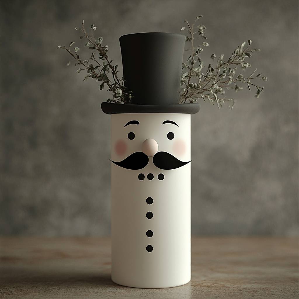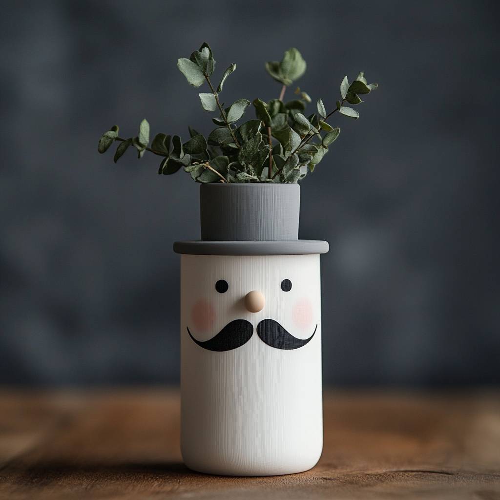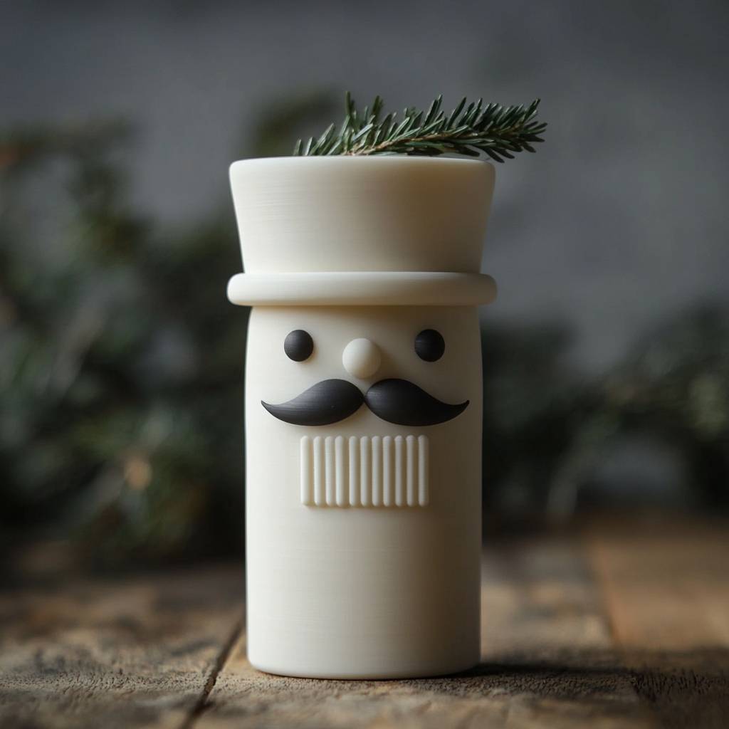 A minimalistic 3D-printed Nutcracker vase, very simple cylinder shape with dot eyes, small mustache, and a flat hat, hollow top for greenery, primitive and classic --ar 1:1 --v 6.1