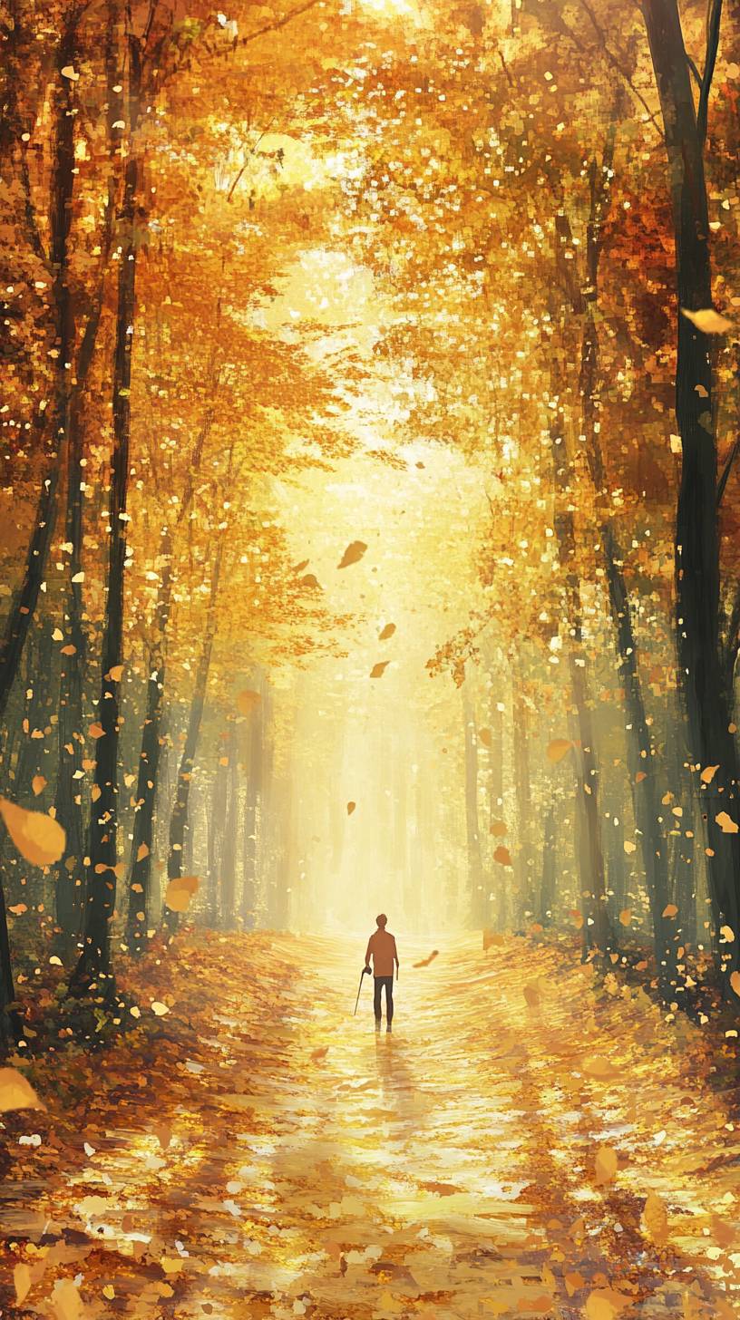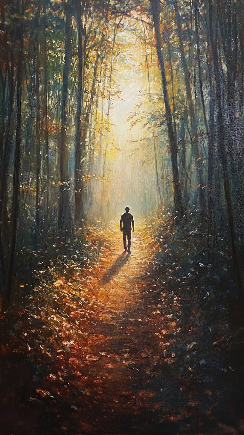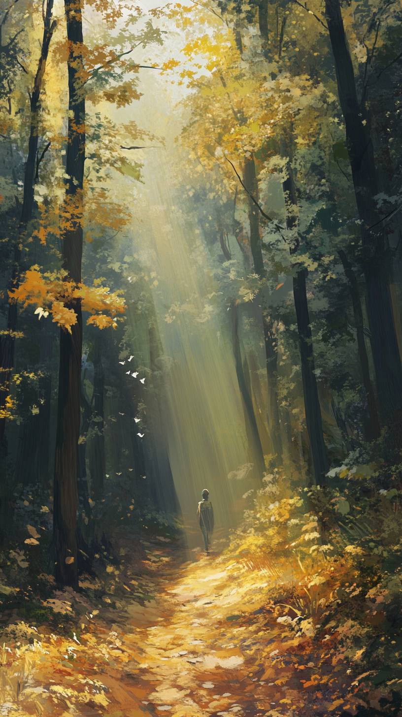 At the first light of morning, the veil of the forest is pierced by the golden sunlight, and the path is dappled. A hiker walks slowly, immersed in the peace of nature. The sunlight filtered through the treetops and sprinkled on the ground covered with fallen leaves, creating a scene of light and shadow. The fresh smell of earth and dew filled the air, and the song of birds echoed through the trees, adding life to the peaceful picture. The figure of the hiker looms in the shadows, his step light and firm, as if in sync with the rhythm of the earth. This is a work showing the harmonious coexistence of man and nature, conveying a deep reverence and love for nature,Surreal, high quality, high resolution --ar 9:16 --stylize 50 --iw 3 --v 6.1