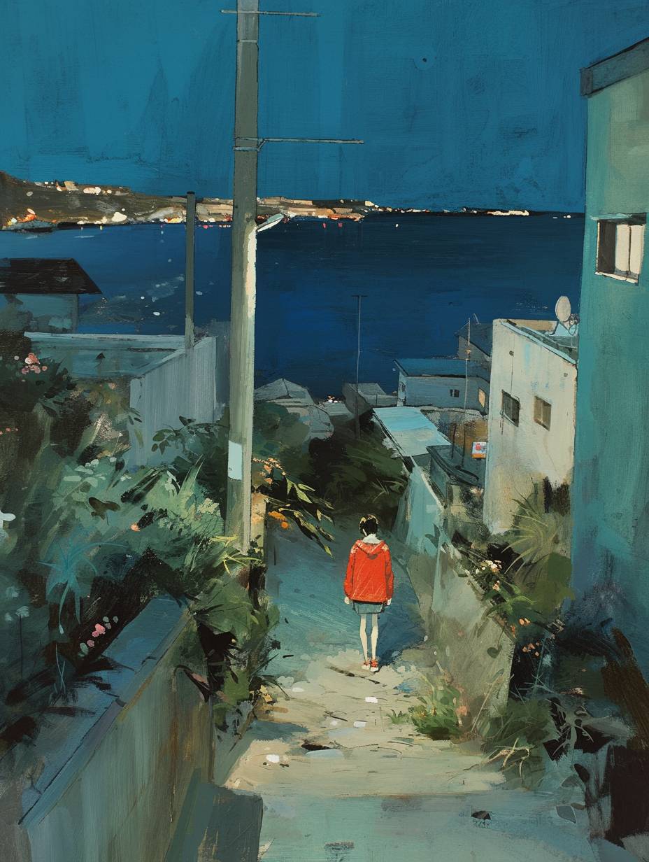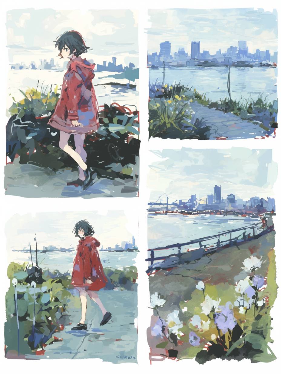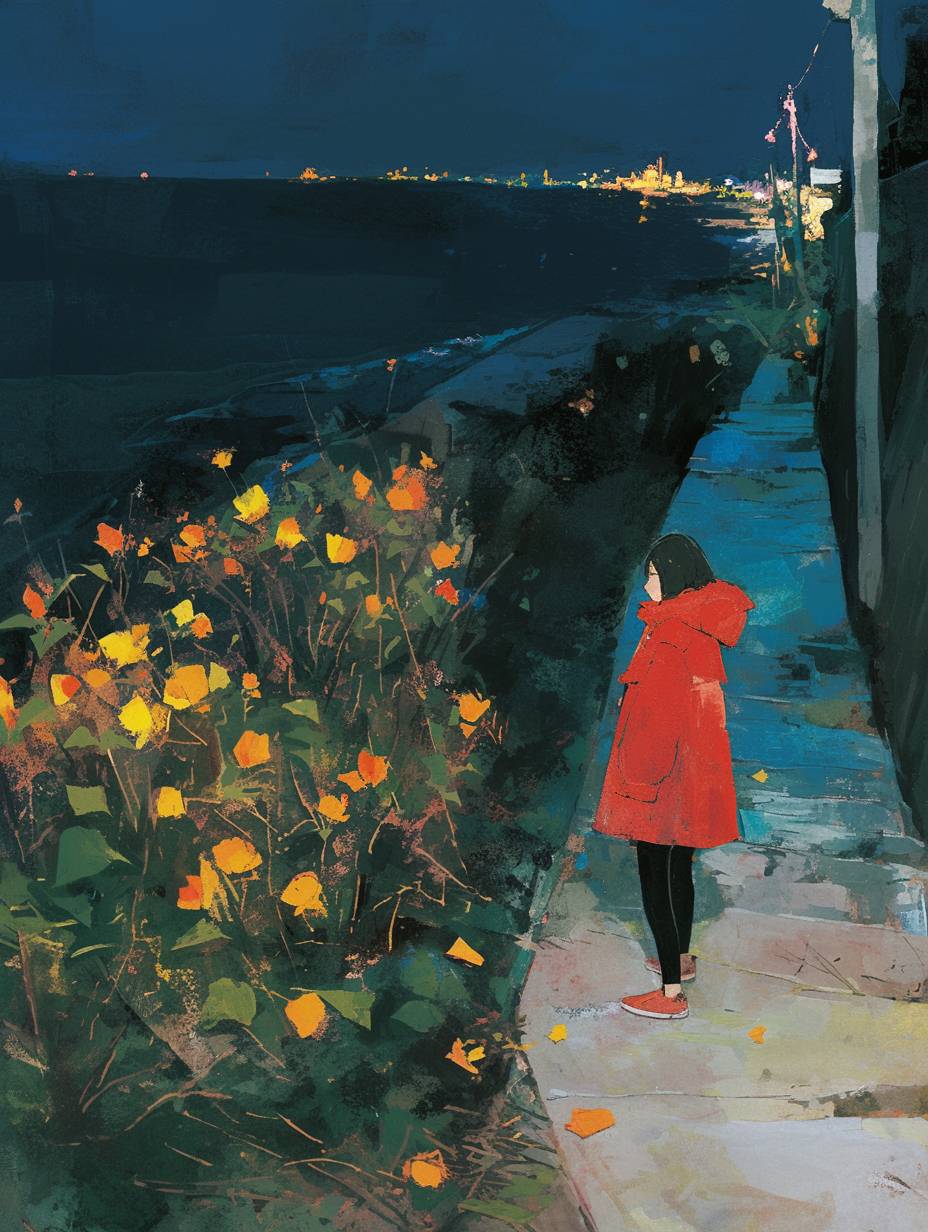 comic panel layout, oilpaint, at night, walking on pathway by a sea in kobe city, plants, flower, short cool woman is short black hair, red parka --ar 3:4 --style raw --personalize jf4kgxi --niji 6