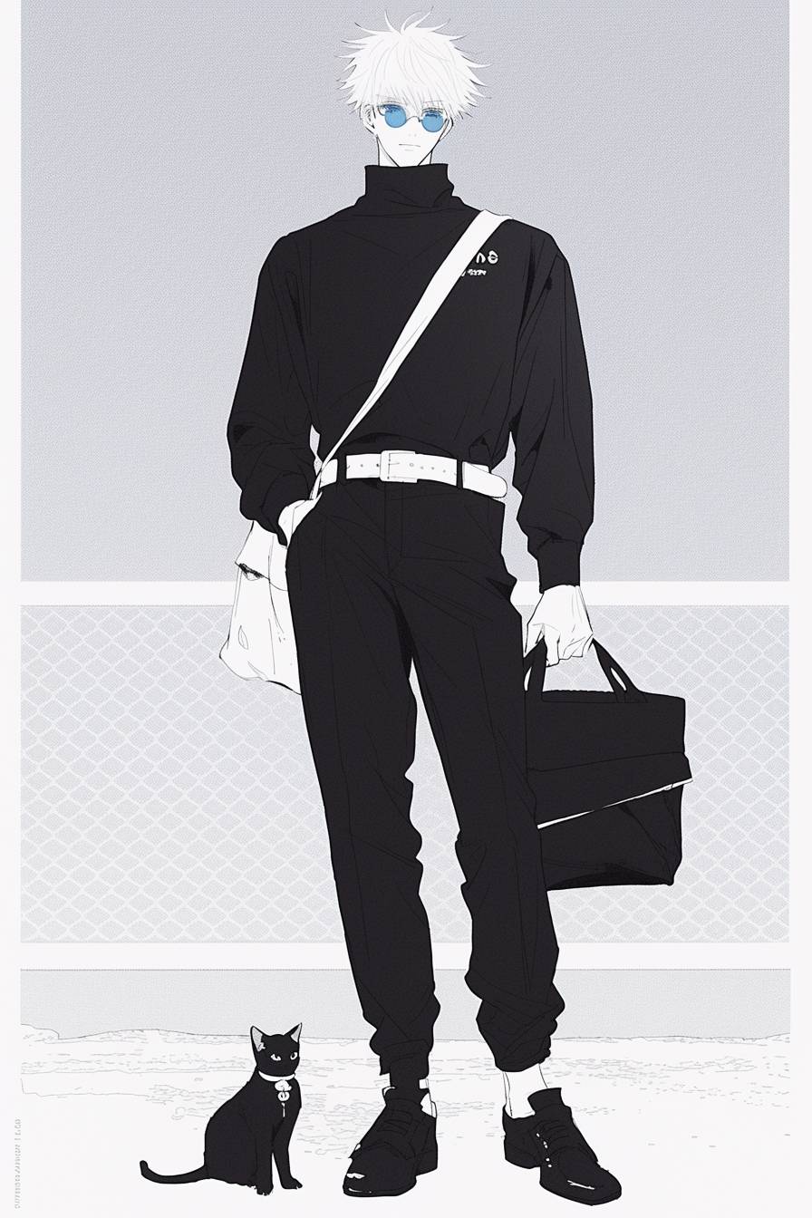 سطر غوجو من جوجوتسو كايسن يظهر في أسلوب الموضة، عيون زرقاء وقط صغير، بأسلوب موبيوس وأكوتامي غيجي.