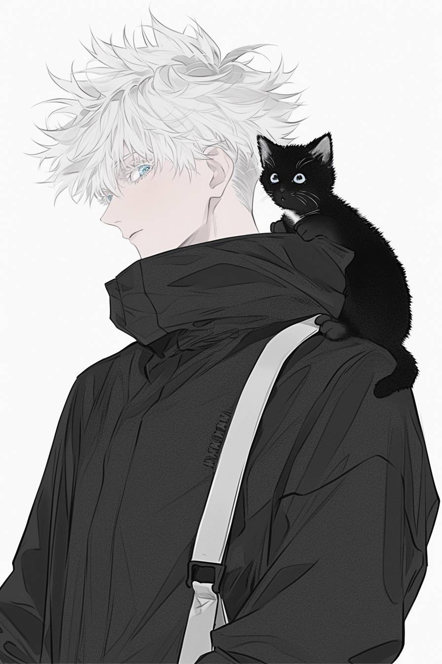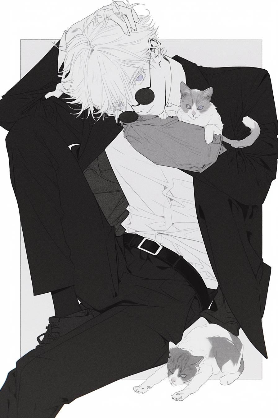 Satoru Gojo from Jujutsu Kaisen,fashion,blue eyes,kitten,in style of Moebius,in style of Akutami Gege --ar 2:3 --style raw --sref 516273906 81523 31011247 2546200890 3048120693 1791691478 --stylize 1000 --niji 6