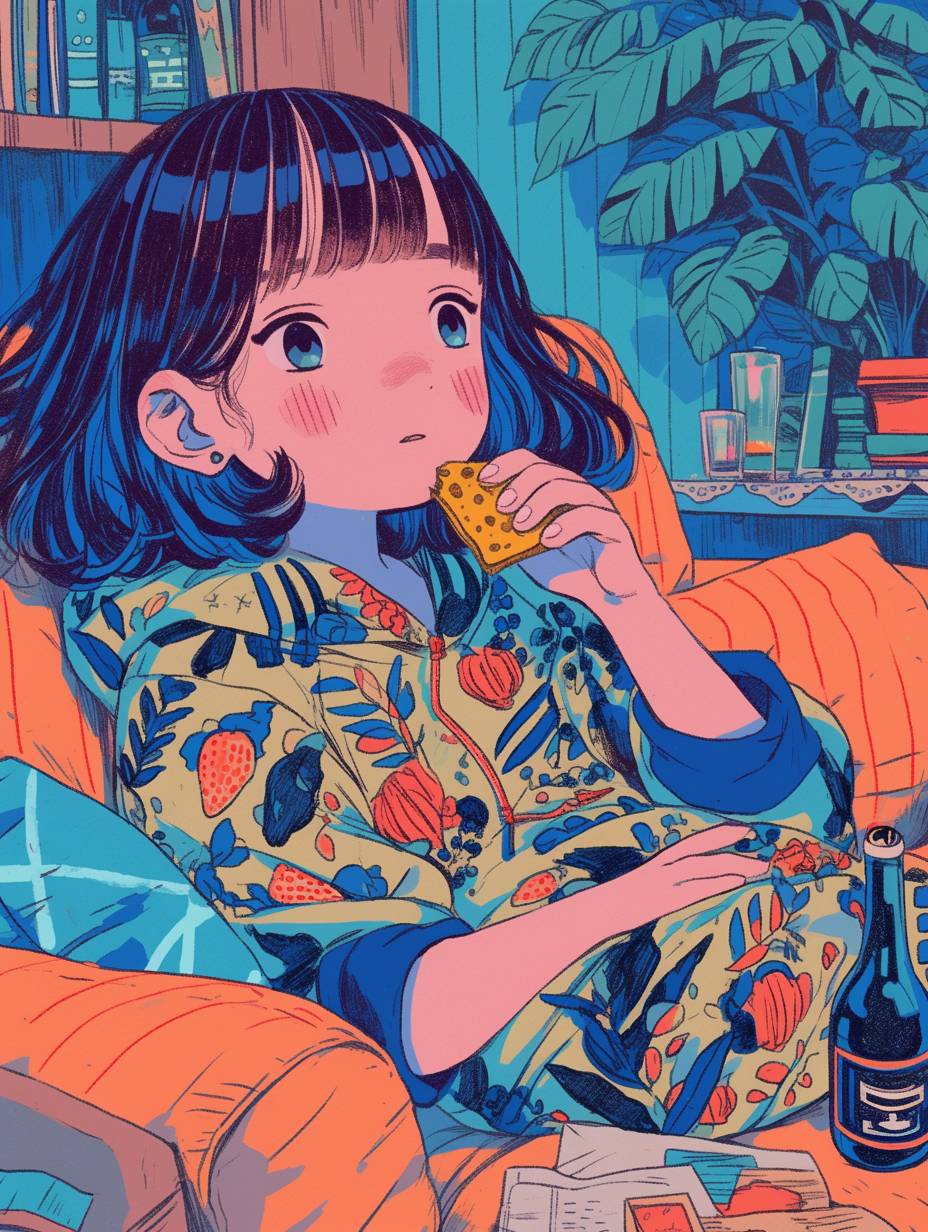 فتاة صغيرة لطيفة تتمايل على الأريكة مع وجبة خفيفة وزجاجة نبيذ، رسم بأسلوب كيث هارينغ، بخطوط عريضة، وألوان صلبة، وتفاصيل بسيطة، وبساطة.