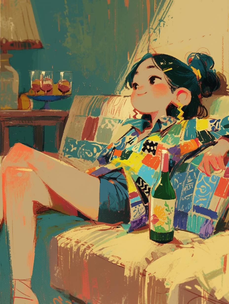 A little cute girl with a snack and a bottle of wine lyingnext to her was lving on the sofa, doodle in the style oKeith Haring, sharpie illustration, bold lines and solidcolors,simple details,minimalism --ar 3:4 --stylize 750 --niji 6