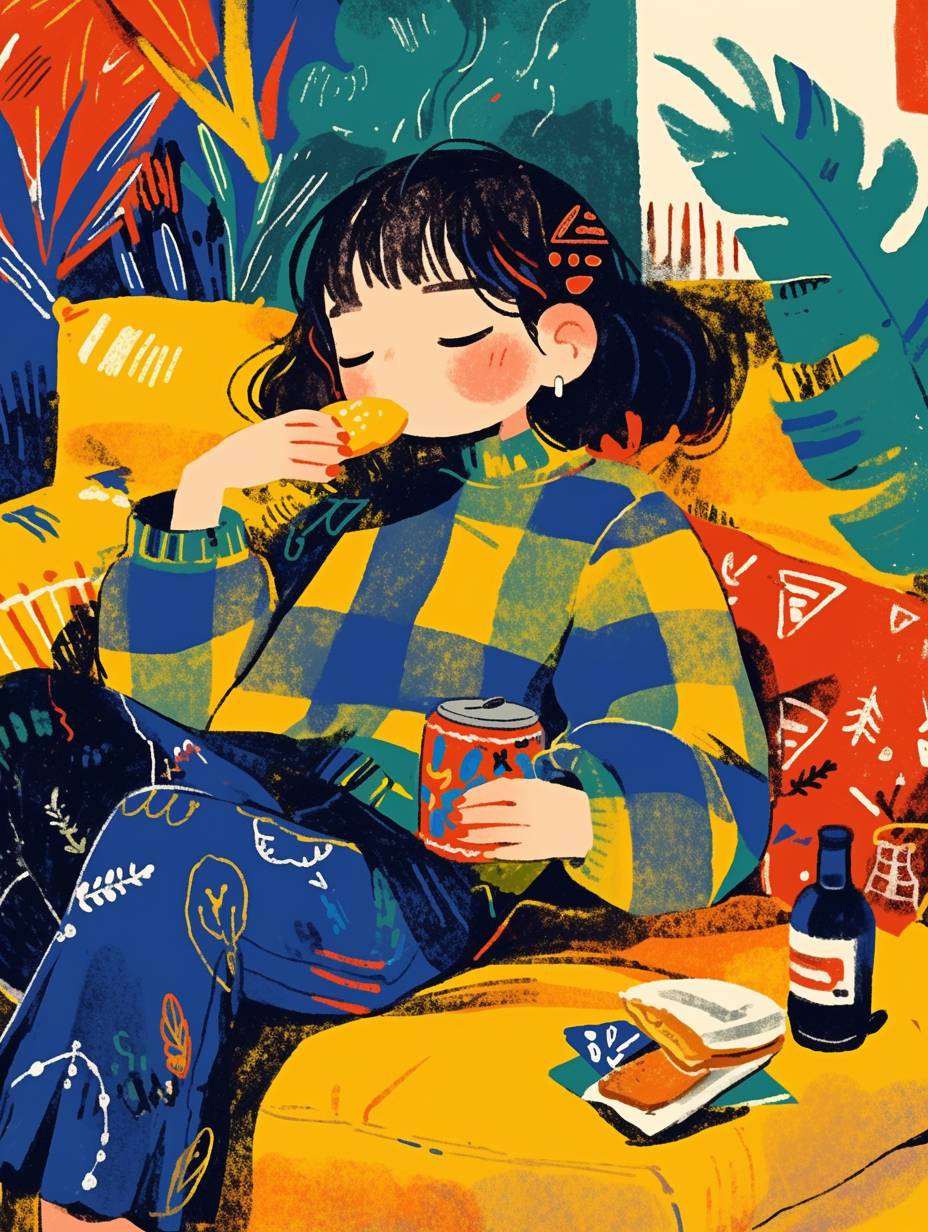 فتاة صغيرة لطيفة مع وجبة خفيفة وزجاجة نبيذ بجوارها مستلقية على الأريكة، رسم بأسلوب كيث هارينغ، توضيح باستخدام قلم حبر، خطوط سميكة وألوان صلبة، تفاصيل بسيطة، بساطة.