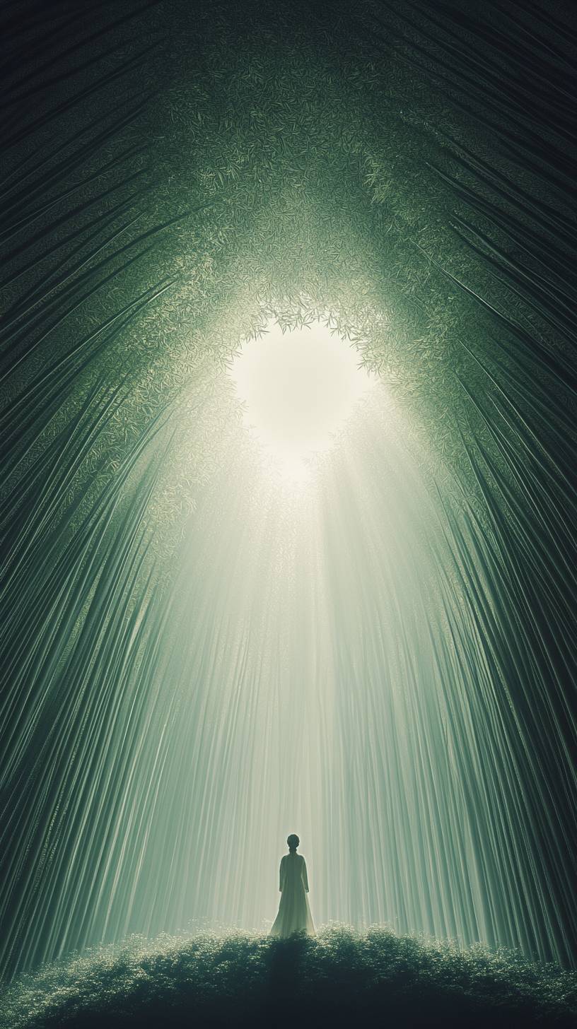A woman in Hanfu stands among the bamboo groves, her silhouette illuminated by golden light. The scene is rendered with a minimalist aesthetic and an ethereal glow, creating a dreamlike atmosphere. This artwork captures the essence of ancient Chinese culture through its elegant composition and soft tones. It embodies simplicity and tranquility, showcasing traditional aesthetics within a modern context. The woman is dressed in traditional , with the artwork rendered in the style of minimalism and tranquility. --chaos 6 --ar 9:16 --personalize ndbewqk --stylize 750 --v 6.1
