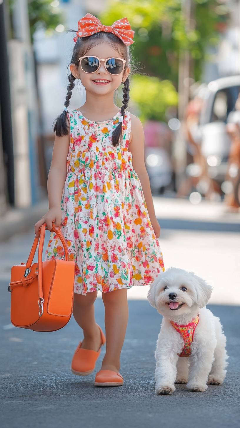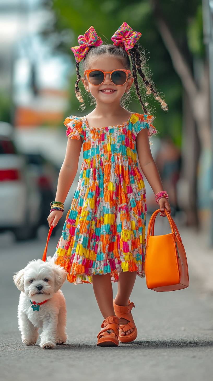 A little girl wearing a colorful dress, her hair braided into two pigtails with bows on top of her head, and sunglasses, is walking down the street holding an orange purse while smiling next to a small white Maltese dog puppy. The scene is cute, lovely, and beautiful, with the girl's colorful outfit and the high-resolution photography capturing the full body shot. --ar 9:16 --v 6.1