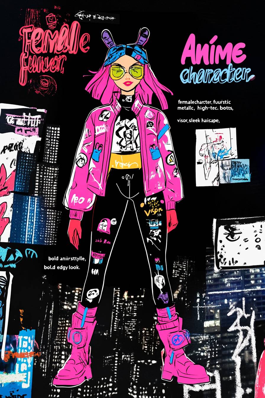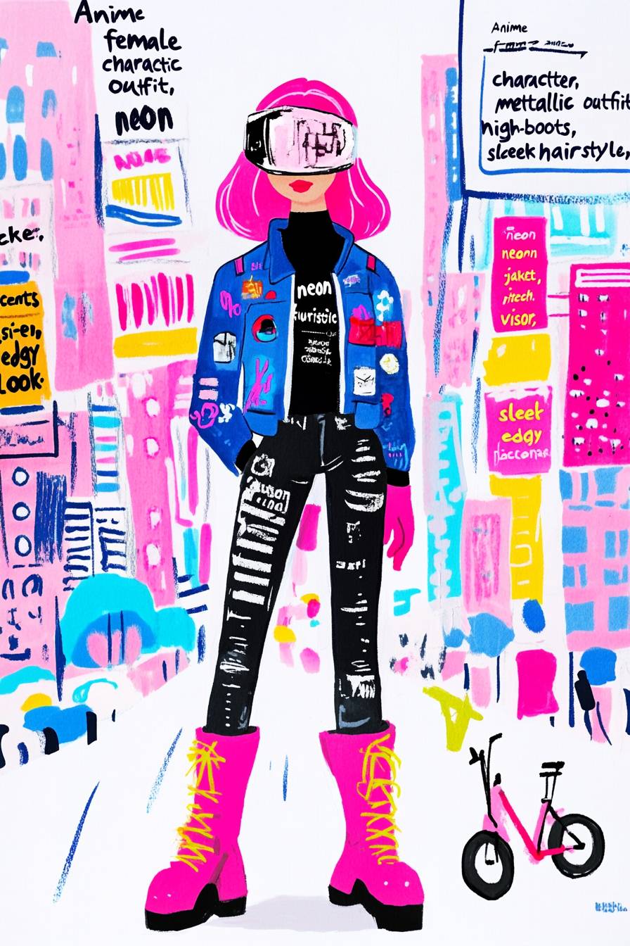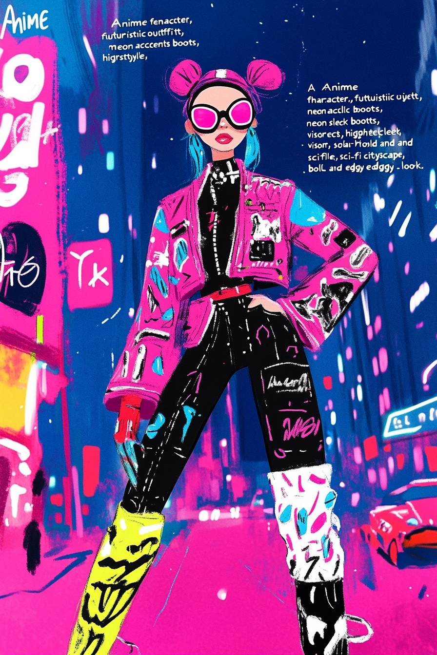 "Anime female character, futuristic outfit, metallic jacket, neon accents, high-tech boots, visor, sleek hairstyle, sci-fi cityscape, bold and edgy look." --sref 474790598 --v 6.1 --ar 2:3