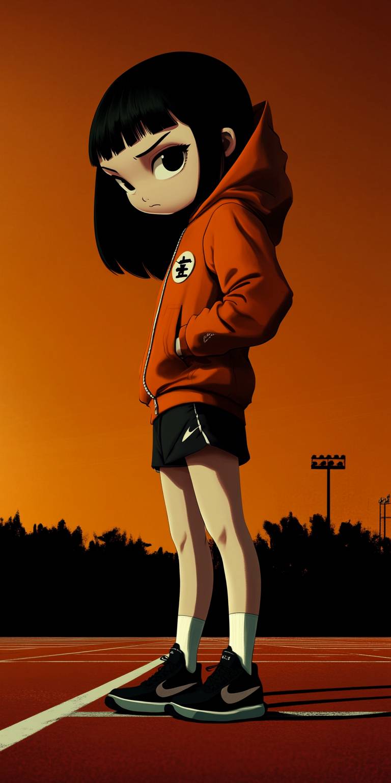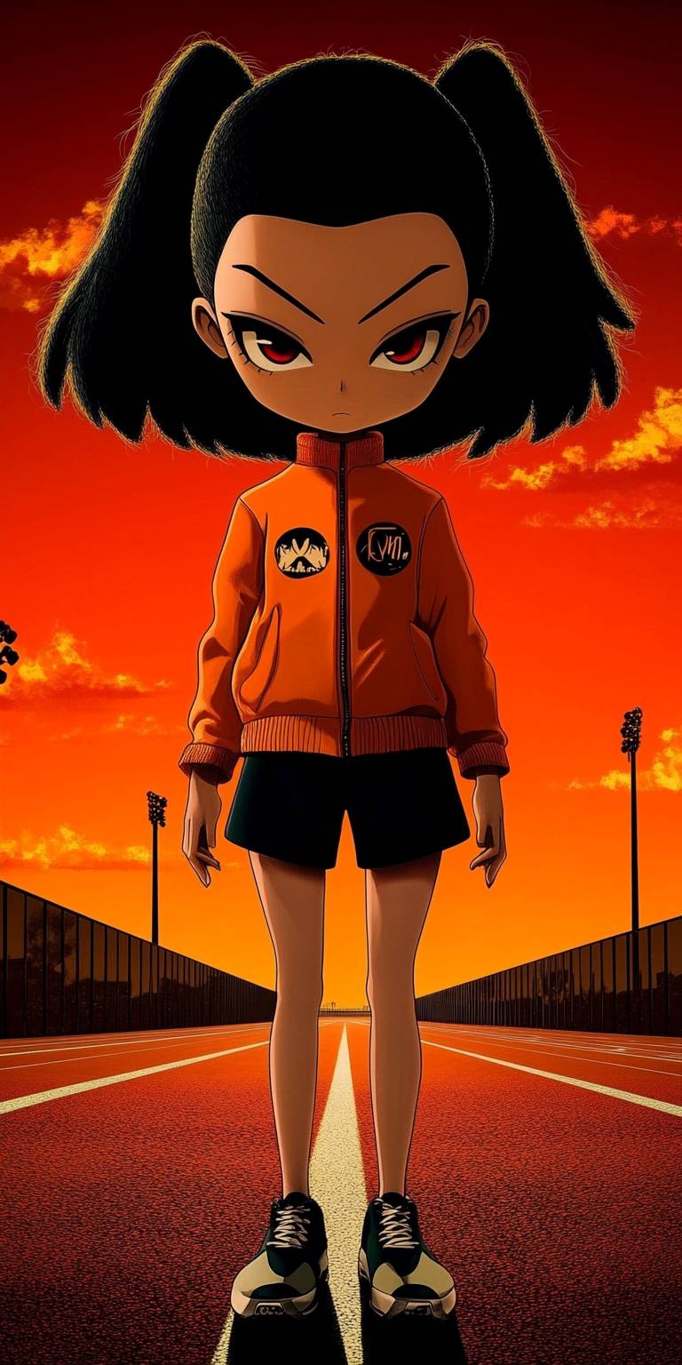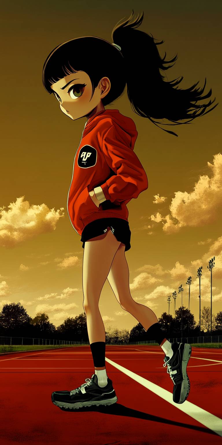 فتاة أنمي بأسلوب رياضي غير رسمي، ترتدي سترة بسحاب وشورتات للجري، على مضمار الجري.
