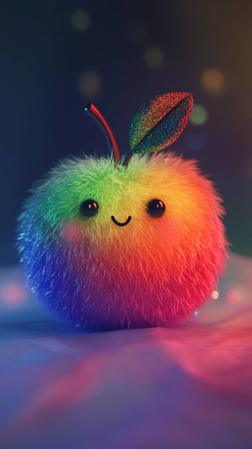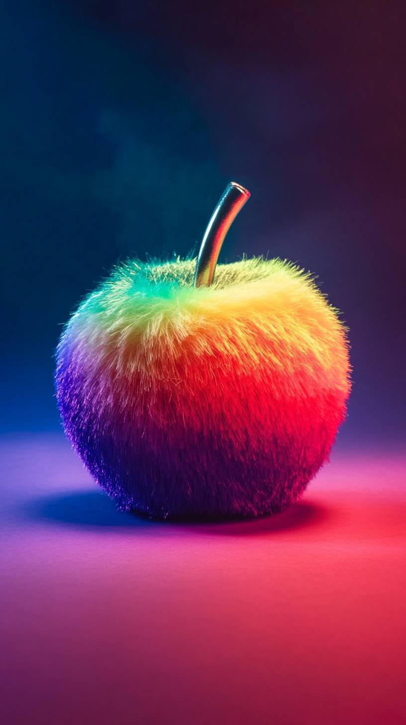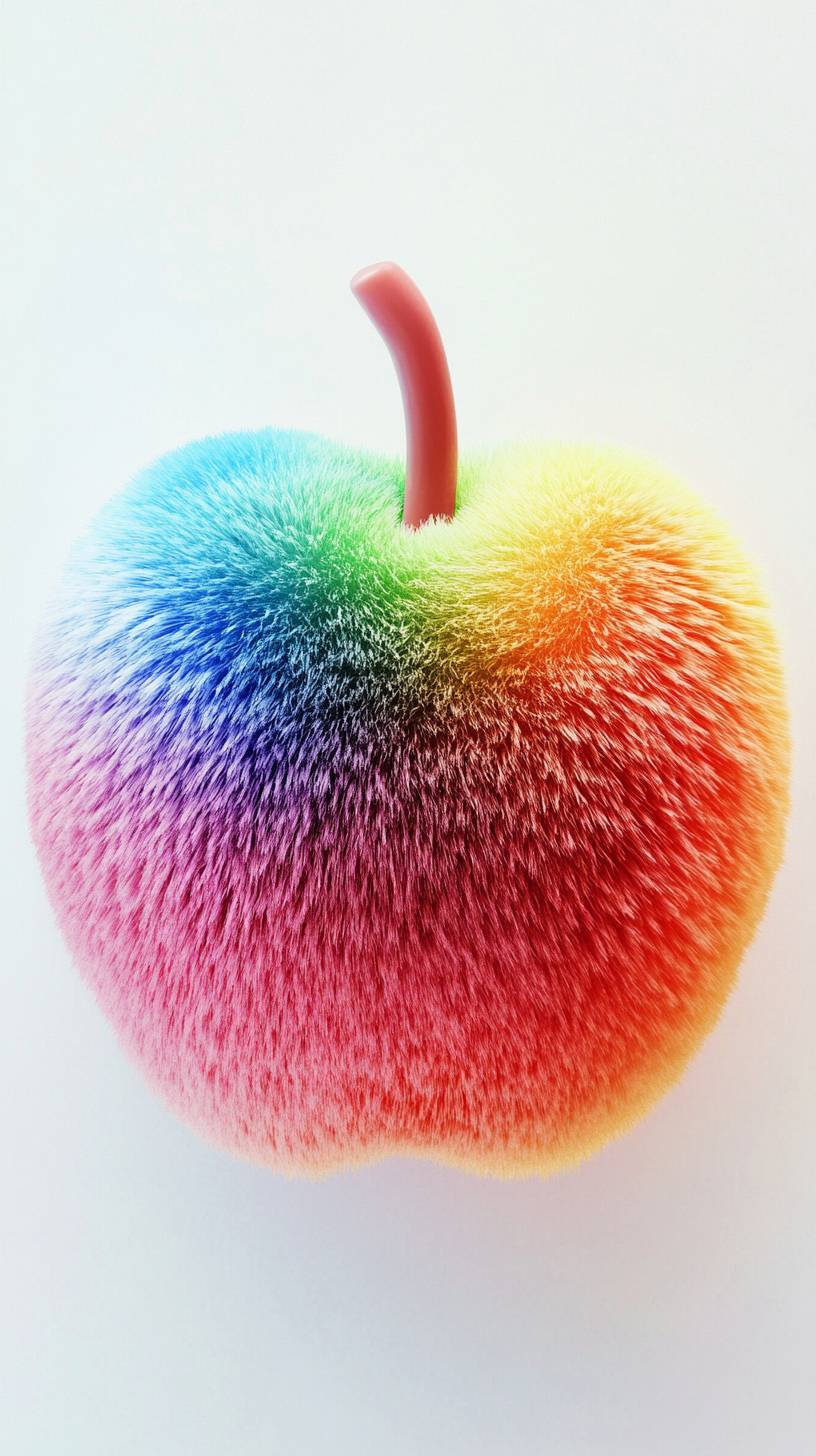 This is a cute, furry, apple shaped, Red Orange Yellow Green Blue Purple object captured with high-definition photography --ar 9:16 --style raw --v 6.1